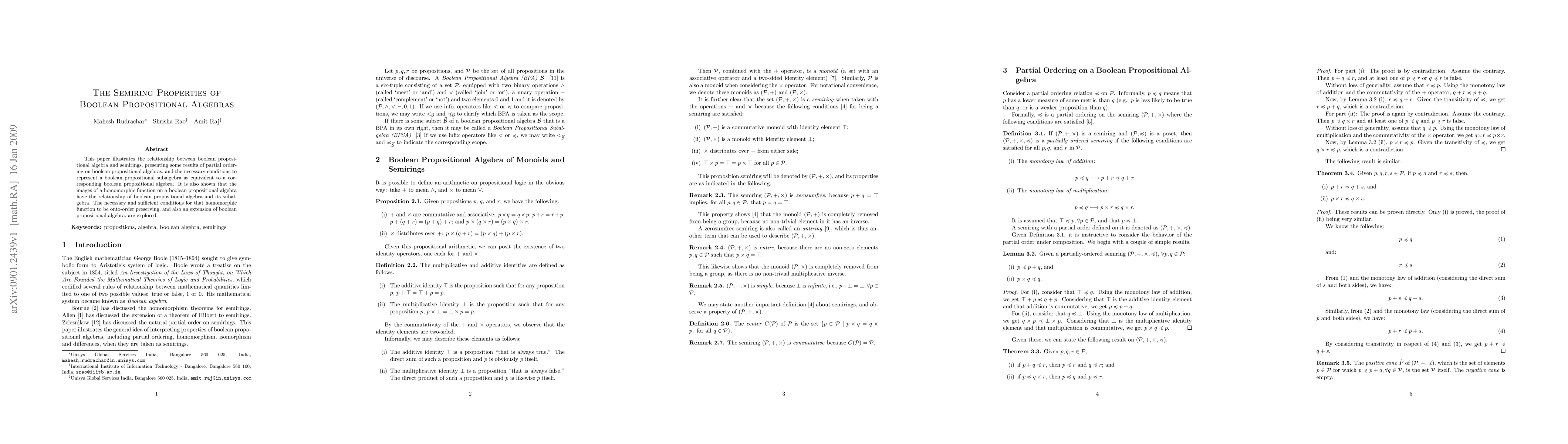 This paper illustrates the relationship between boolean propositional algebra and semirings, presenting some results of partial ordering on boolean propositional algebras, and the necessary conditions to represent a boolean propositional subalgebra as equivalent to a corresponding boolean propositional algebra. It is also shown that the images of a homomorphic function on a boolean propositional algebra have the relationship of boolean propositional algebra and its subalgebra. The necessary and sufficient conditions for that homomorphic function to be onto-order preserving, and also an extension of boolean propositional algebra, are explored.