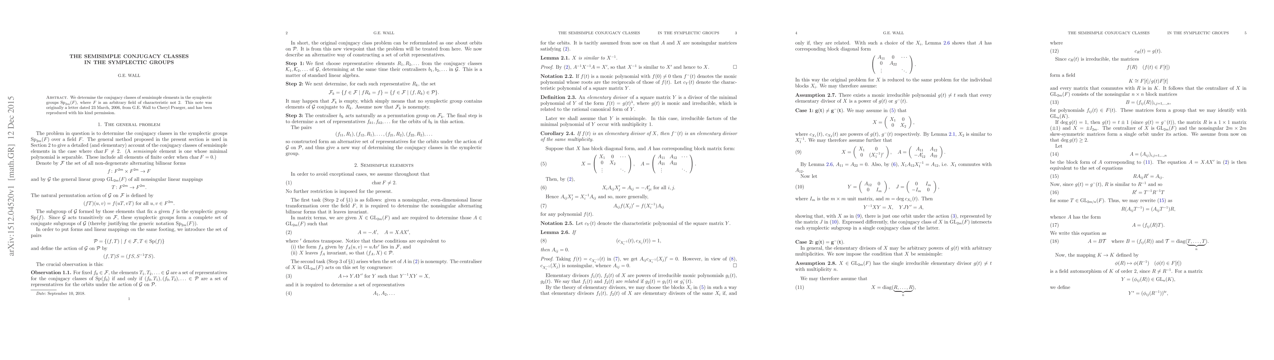 This paper identifies the conjugacy classes of semisimple elements in symplectic groups ${\rm Sp}(2m,F)$ over fields of characteristic not equal to $2$, as originally communicated in a 2006 letter by G.E. Wall to Cheryl E. Praeger. The reproduction of this note provides foundational insights into the structure of these groups.