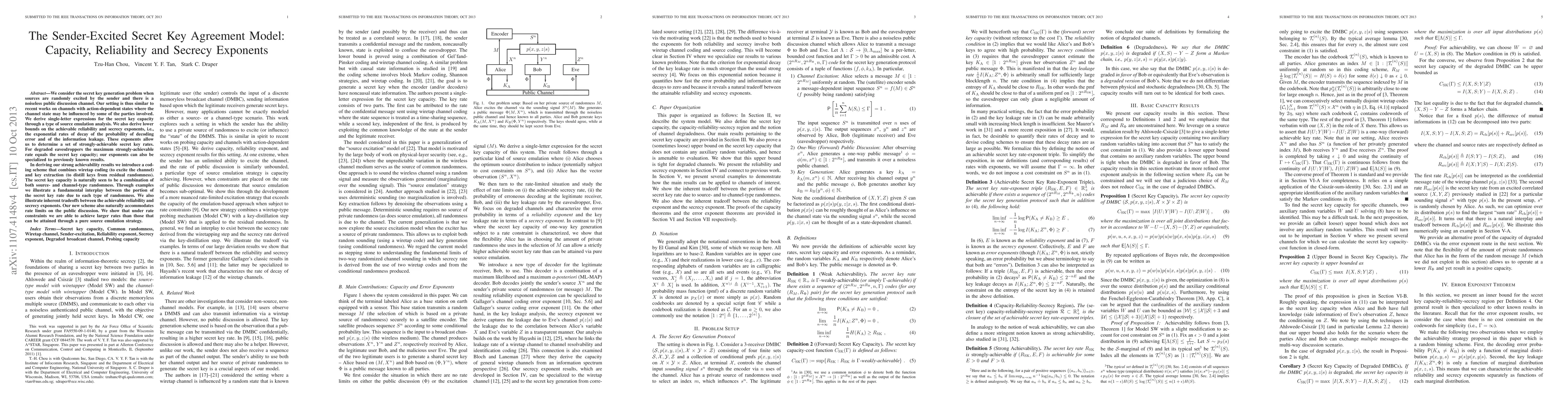 This paper explores secret key generation in a scenario where sources are randomly excited by the sender, with a noiseless public discussion channel. It derives expressions for secret key capacity, reliability, and secrecy exponents, introducing a new coding scheme combining wiretap coding and key extraction. The study reveals tradeoffs between reliability and secrecy exponents and demonstrates improved rates under public discussion rate constraints.