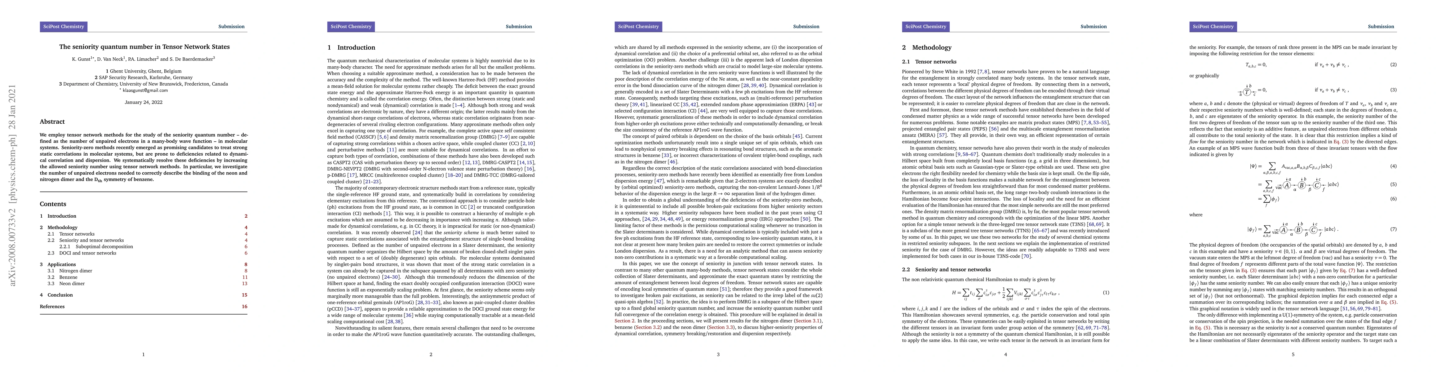 We employ tensor network methods for the study of the seniority quantum number - defined as the number of unpaired electrons in a many-body wave function - in molecular systems. Seniority-zero methods recently emerged as promising candidates to treat strong static correlations in molecular systems, but are prone to deficiencies related to dynamical correlation and dispersion. We systematically resolve these deficiencies by increasing the allowed seniority number using tensor network methods. In particular, we investigate the number of unpaired electrons needed to correctly describe the binding of the neon and nitrogen dimer and the $D_{6h}$ symmetry of benzene.