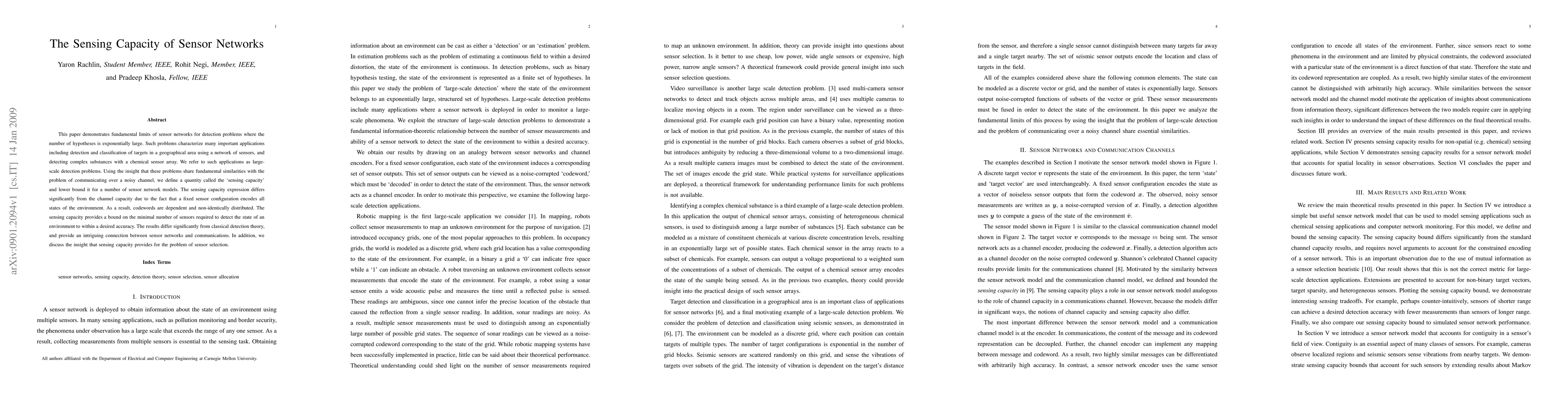 This paper demonstrates fundamental limits of sensor networks for detection problems where the number of hypotheses is exponentially large. Such problems characterize many important applications including detection and classification of targets in a geographical area using a network of sensors, and detecting complex substances with a chemical sensor array. We refer to such applications as largescale detection problems. Using the insight that these problems share fundamental similarities with the problem of communicating over a noisy channel, we define a quantity called the sensing capacity and lower bound it for a number of sensor network models. The sensing capacity expression differs significantly from the channel capacity due to the fact that a fixed sensor configuration encodes all states of the environment. As a result, codewords are dependent and non-identically distributed. The sensing capacity provides a bound on the minimal number of sensors required to detect the state of an environment to within a desired accuracy. The results differ significantly from classical detection theory, and provide an ntriguing connection between sensor networks and communications. In addition, we discuss the insight that sensing capacity provides for the problem of sensor selection.
