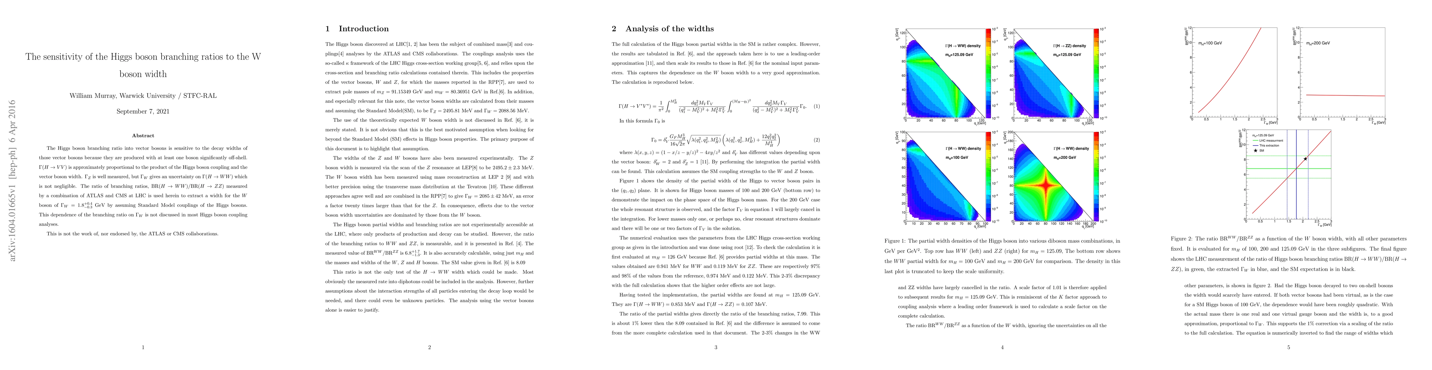 The Higgs boson branching ratio into vector bosons is sensitive to the decay widths of those vector bosons because they are produced with at least one boson significantly off-shell. Gamma(H to V V ) is approximately proportional to the product of the Higgs boson coupling and the vector boson width. Gamma Z is well known, but Gamma W gives an uncertainty on Gamma(H to W W ) which is not negligible. The ratio of branching ratios, BR(H to W W )/BR(H to ZZ) measured by a combination of ATLAS and CMS at LHC is used herein to extract a width for the W boson of Gamma W = 1.8+0.4-0.3 GeV by assuming Standard Model couplings of the Higgs bosons. This dependence of the branching ratio on Gamma W is not discussed in most Higgs boson coupling analyses.