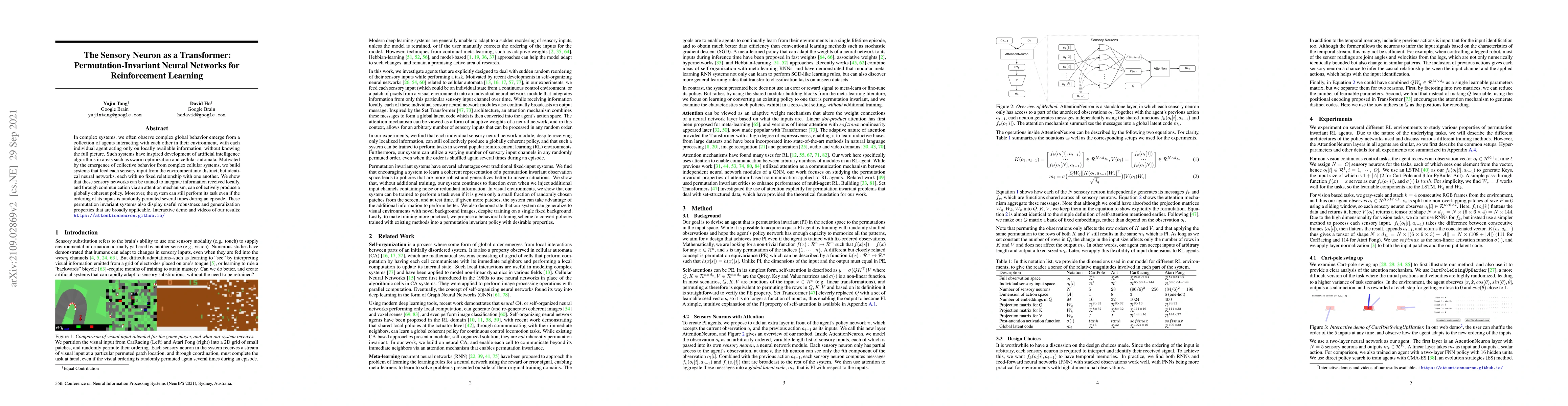 In complex systems, we often observe complex global behavior emerge from a collection of agents interacting with each other in their environment, with each individual agent acting only on locally available information, without knowing the full picture. Such systems have inspired development of artificial intelligence algorithms in areas such as swarm optimization and cellular automata. Motivated by the emergence of collective behavior from complex cellular systems, we build systems that feed each sensory input from the environment into distinct, but identical neural networks, each with no fixed relationship with one another. We show that these sensory networks can be trained to integrate information received locally, and through communication via an attention mechanism, can collectively produce a globally coherent policy. Moreover, the system can still perform its task even if the ordering of its inputs is randomly permuted several times during an episode. These permutation invariant systems also display useful robustness and generalization properties that are broadly applicable. Interactive demo and videos of our results: https://attentionneuron.github.io/