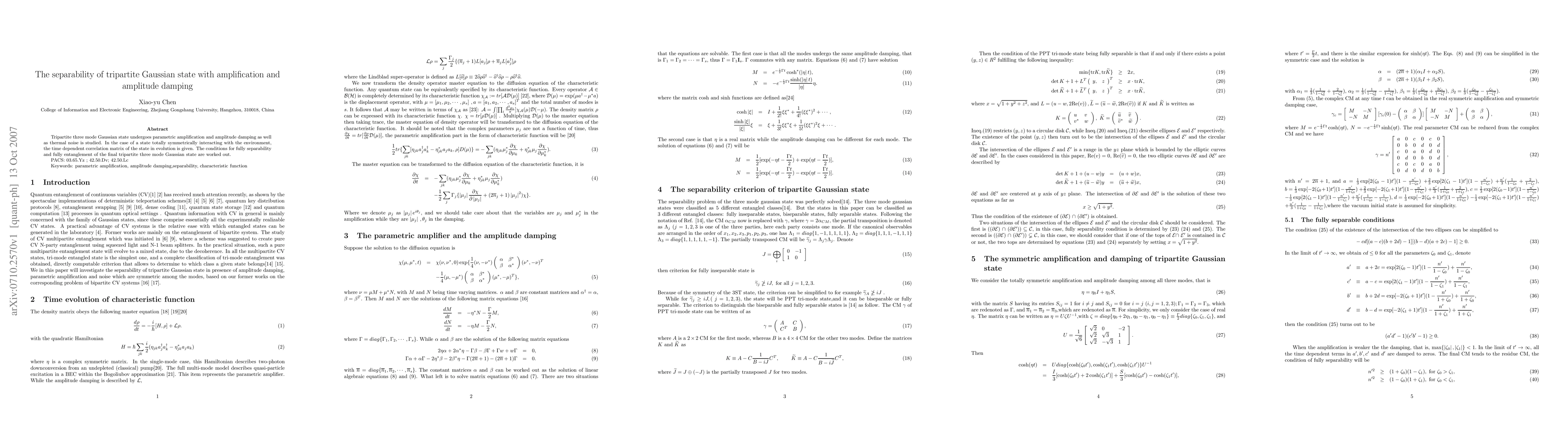 Tripartite three mode Gaussian state undergoes parametric amplification and amplitude damping as well as thermal noise is studied. In the case of a state totally symmetrically interacting with the environment, the time dependent correlation matrix of the state in evolution is given. The conditions for fully separability and fully entanglement of the final tripartite three mode Gaussian state are worked out.