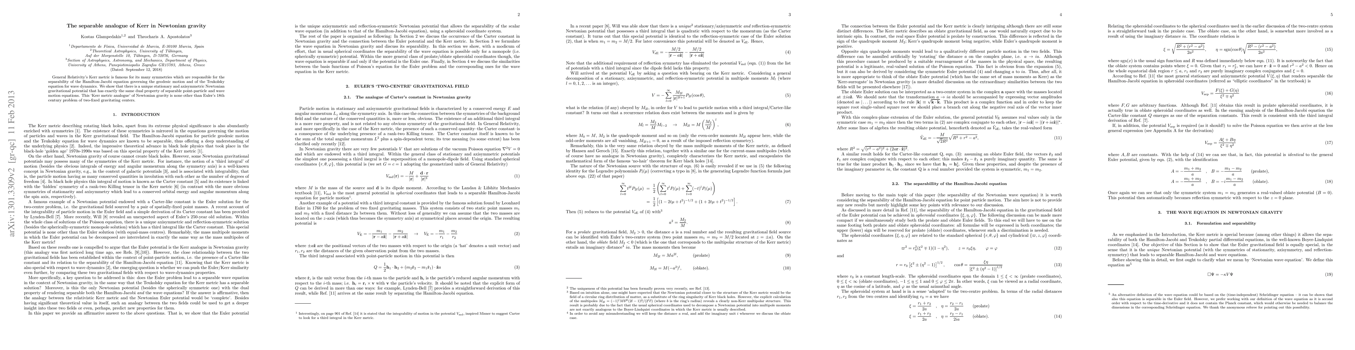 General Relativity's Kerr metric is famous for its many symmetries which are responsible for the separability of the Hamilton-Jacobi equation governing the geodesic motion and of the Teukolsky equation for wave dynamics. We show that there is a unique stationary and axisymmetric Newtonian gravitational potential that has exactly the same dual property of separable point-particle and wave motion equations. This `Kerr metric analogue' of Newtonian gravity is none other than Euler's 18th century problem of two-fixed gravitating centers.