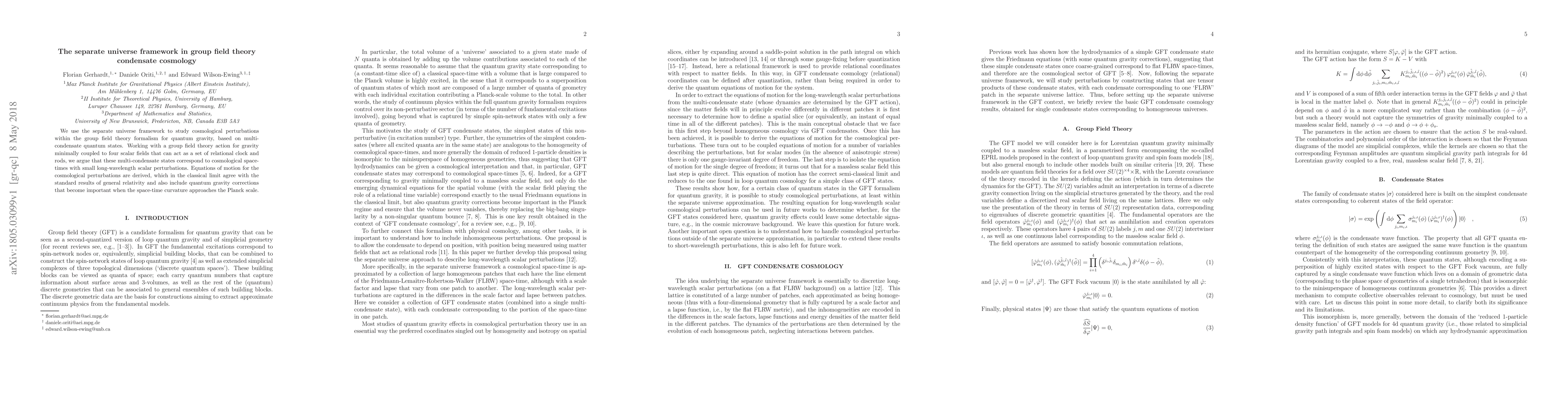This paper explores the separate universe framework in the context of group field theory condensate cosmology to study cosmological perturbations. It derives equations of motion for these perturbations, showing classical agreement with general relativity and incorporating quantum gravity corrections relevant at Planck scale curvatures.