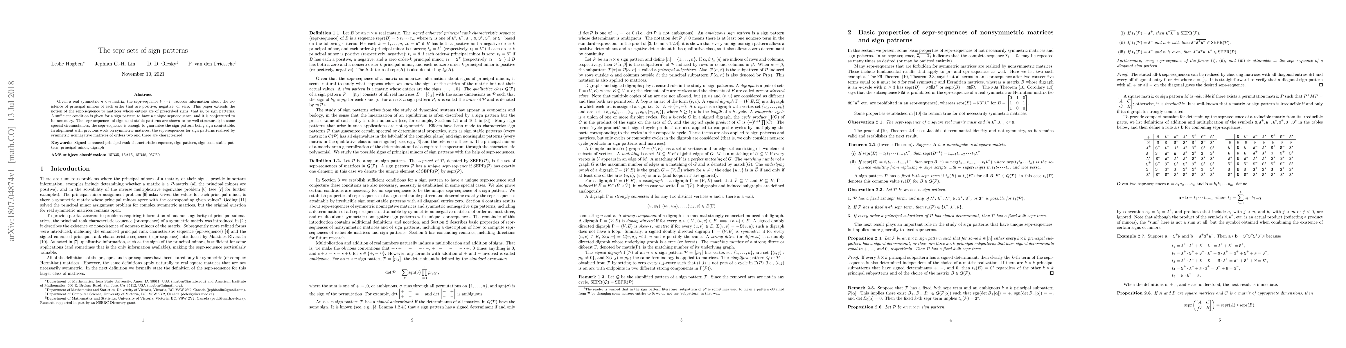 Given a real symmetric $n\times n$ matrix, the sepr-sequence $t_1\cdots t_n$ records information about the existence of principal minors of each order that are positive, negative, or zero. This paper extends the notion of the sepr-sequence to matrices whose entries are of prescribed signs, that is, to sign patterns. A sufficient condition is given for a sign pattern to have a unique sepr-sequence, and it is conjectured to be necessary. The sepr-sequences of sign semi-stable patterns are shown to be well-structured; in some special circumstances, the sepr-sequence is enough to guarantee the sign pattern being sign semi-stable. In alignment with previous work on symmetric matrices, the sepr-sequences for sign patterns realized by symmetric nonnegative matrices of orders two and three are characterized.