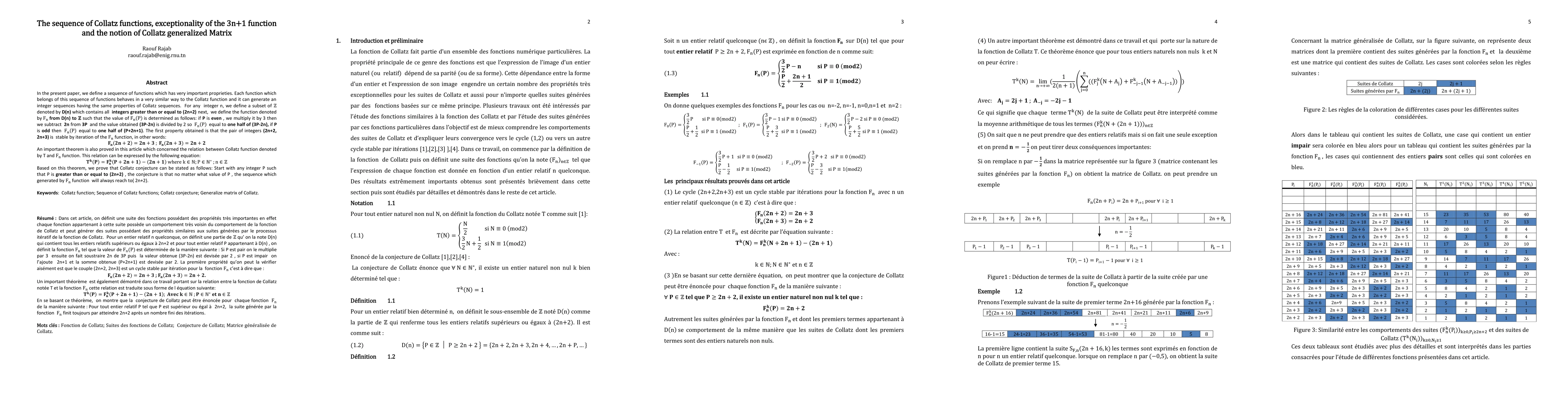 In this article, we define a very important sequence of functions, all the functions of this sequence present behaviors very close to that of the Collatz function. The study of such functions allows us to obtain very interesting results concerning the collatz conjecture and more precisely concerning the generalization of this problem, the nature of the Collatz function, on the statement of the Collatz conjecture we show that this conjecture can be stated for each function on a well-determined subset of Z and other interesting properties in relation to the behaviors of Collatz sequences are studied and proved in this article.