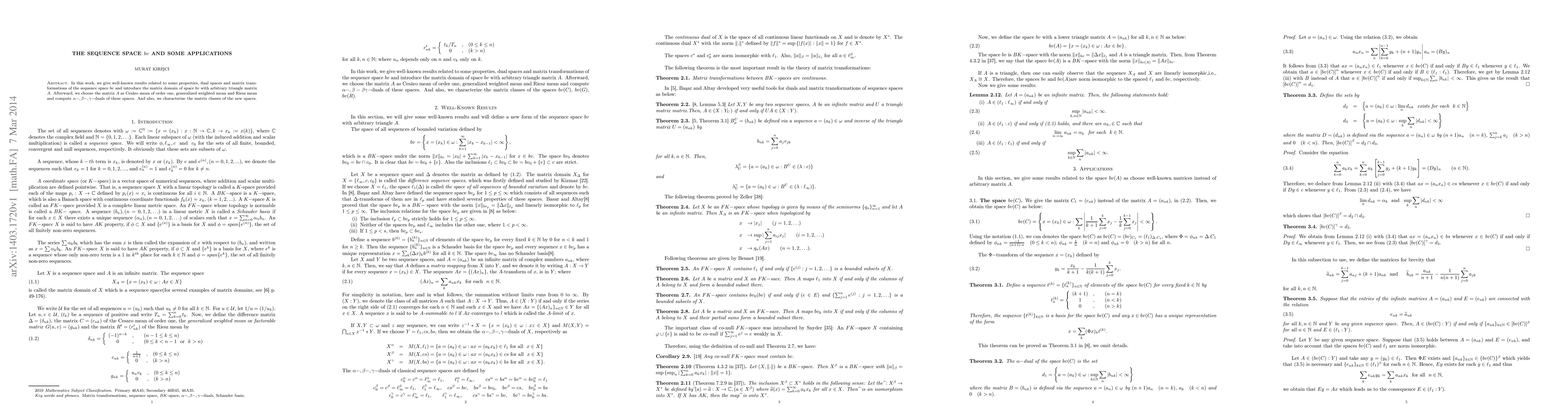 In this work, we give well-known results related to some properties, dual spaces and matrix transformations of the sequence space bv and introduce the matrix domain of space bv with arbitrary triangle matrix A. Afterward, we choose the matrix A as Ces\`aro mean of order one, generalized weighted mean and Riesz mean and compute alpha-; beta- gamma-duals of these spaces. And also, we characterize the matrix classes of the new spaces.