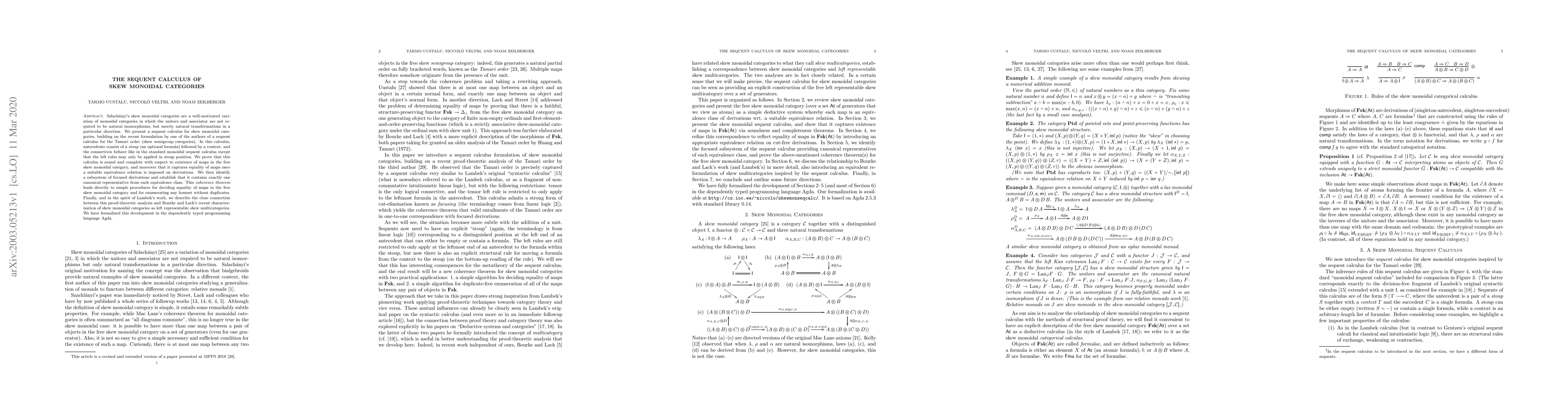 The paper presents a sequent calculus for skew monoidal categories, demonstrating its soundness and completeness. It introduces a focused subsystem with a canonical representative for each equivalence class, enabling efficient decision procedures for map equality and enumeration. The work is formalized in Agda, linking proof-theoretic analysis to left representable skew multicategories.