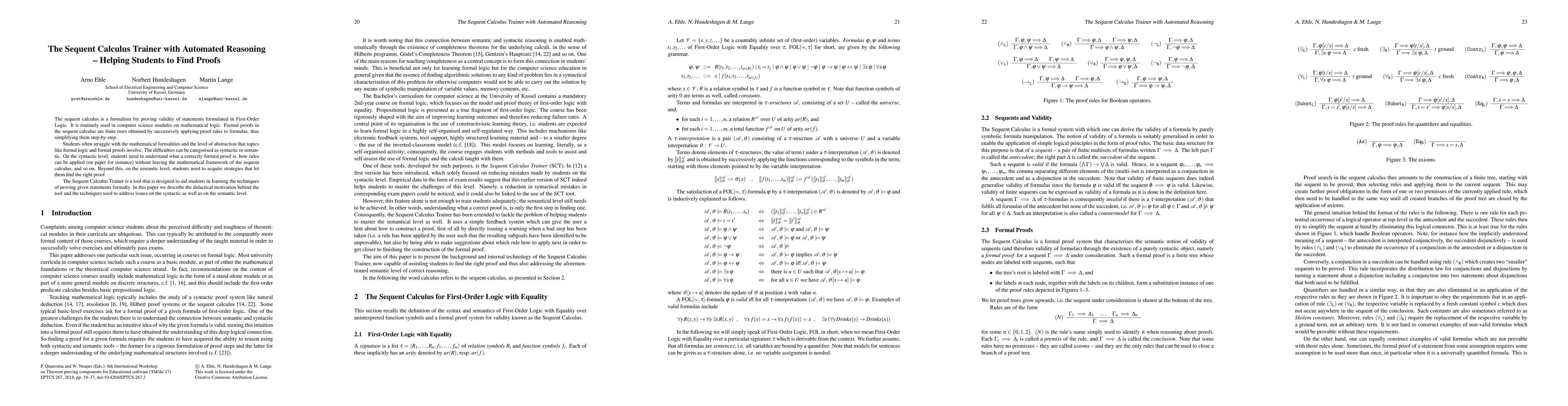 The Sequent Calculus Trainer is an educational tool designed to assist students in mastering formal proof techniques in first-order logic, addressing both syntactic understanding and semantic proof strategies through interactive learning. The tool aims to alleviate the difficulties students face in grasping the complexities of sequent calculus proofs.