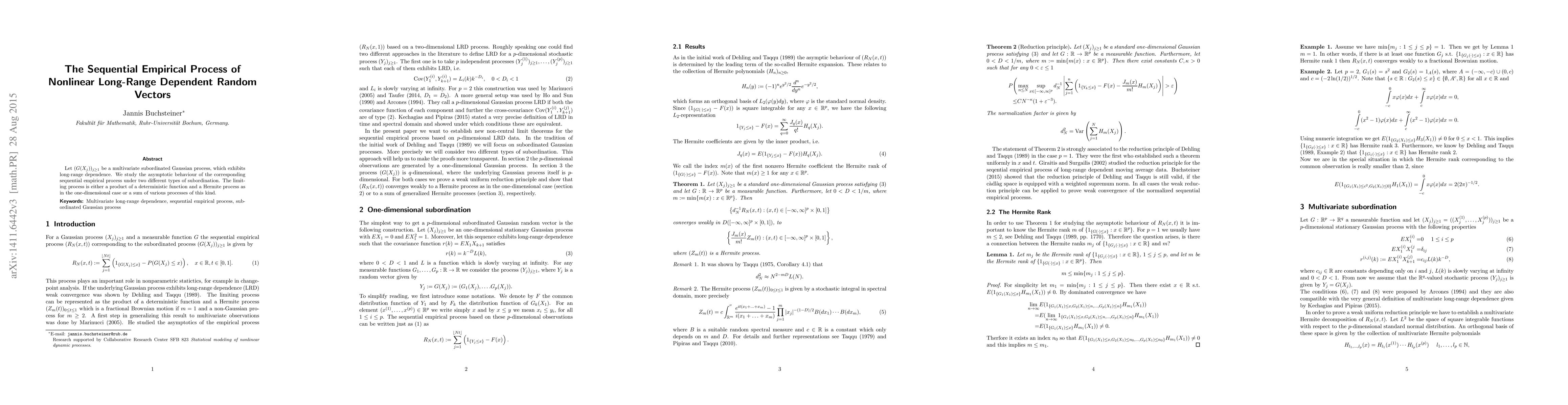 Let $(G(X_j))_{j\geq1}$ be a multivariate subordinated Gaussian process, which exhibits long-range dependence. We study the asymptotic behaviour of the corresponding sequential empirical process under two different types of subordination. The limiting process is either a product of a deterministic function and a Hermite process as in the one-dimensional case or a sum of various processes of this kind.