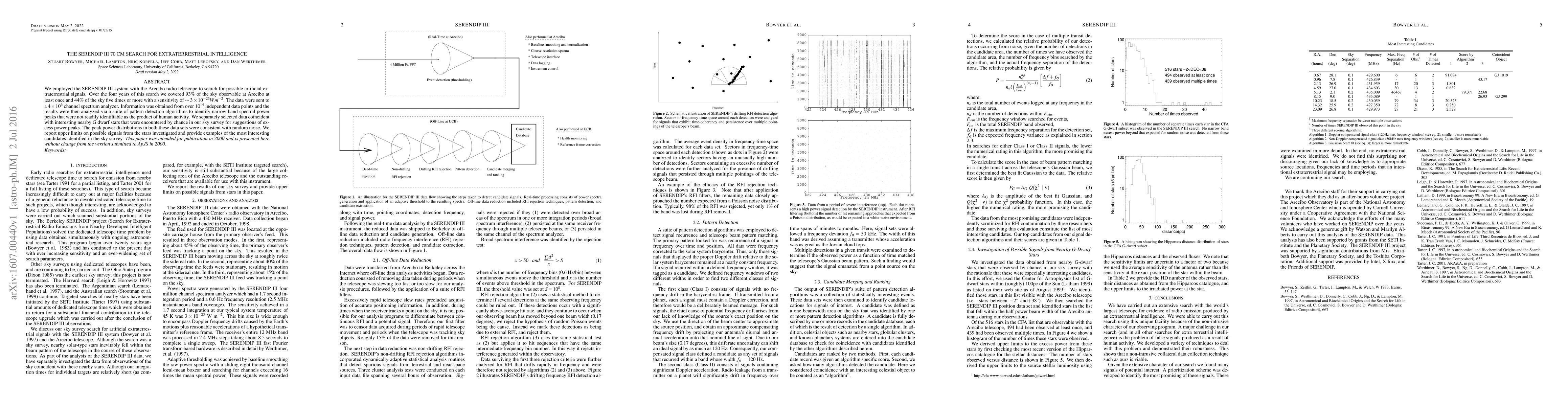 The SERENDIP III project used the Arecibo telescope to search for extraterrestrial signals, analyzing over 10^14 data points with no definitive evidence of artificial signals found. Upper limits on potential signals from nearby G dwarf stars were reported, concluding that any detected power peaks were consistent with random noise.
