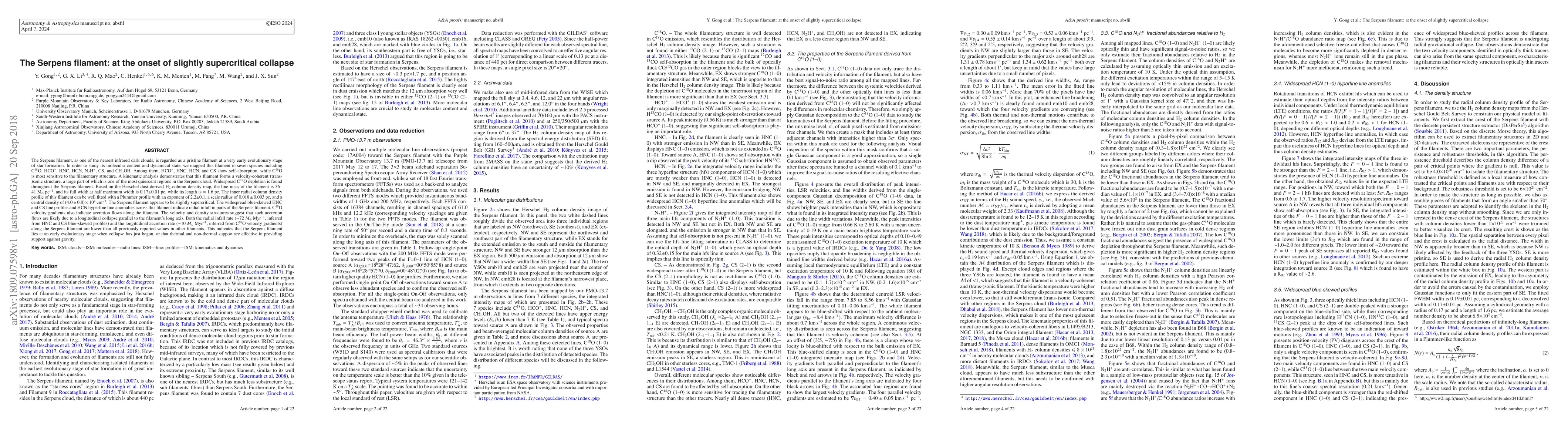 The Serpens filament, a nearby infrared dark cloud, shows early signs of star formation with low infall and accretion rates. Its molecular content and velocity-coherent structure indicate a slightly supercritical collapse, suggesting it is in an early evolutionary stage.