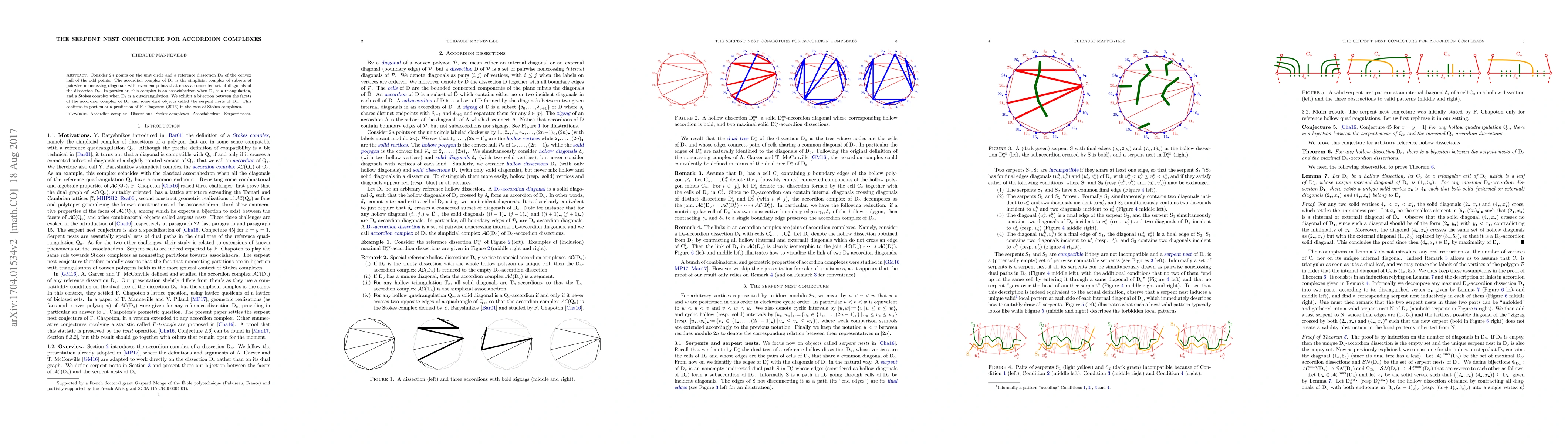Consider 2n points on the unit circle and a reference dissection D of the convex hull of the odd points. The accordion complex of D is the simplicial complex of subsets of pairwise noncrossing diagonals with even endpoints that cross a connected set of diagonals of the dissection D. In particular, this complex is an associahedron when D is a triangulation, and a Stokes complex when D is a quadrangulation. We exhibit a bijection between the facets of the accordion complex of D and some dual objects called the serpent nests of D, settling in particular a conjecture stated by F.~Chapoton (2016) in the case of Stokes complexes.