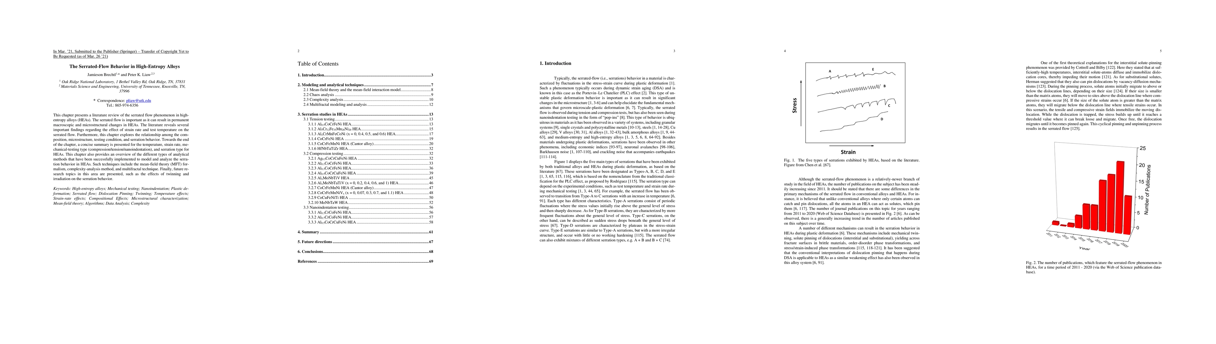 This chapter presents a literature review of the serrated flow phenomenon in high-entropy alloys (HEAs). The serrated flow is important as it can result in permanent macroscopic and microstructural changes in HEAs. The literature reveals several important findings regarding the effect of strain rate and test temperature on the serrated flow. Furthermore, this chapter explores the relationship among the composition, microstructure, testing condition, and serration behavior. Towards the end of the chapter, a concise summary is presented for the temperature, strain rate, mechanical-testing type (compression/tension/nanoindentation), and serration type for HEAs. This chapter also provides an overview of the different types of analytical methods that have been successfully implemented to model and analyze the serration behavior in HEAs. Such techniques include the mean-field theory (MFT) formalism, complexity-analysis method, and multifractal technique. Finally, future research topics in this area are presented, such as the effects of twinning and irradiation on the serration behavior.