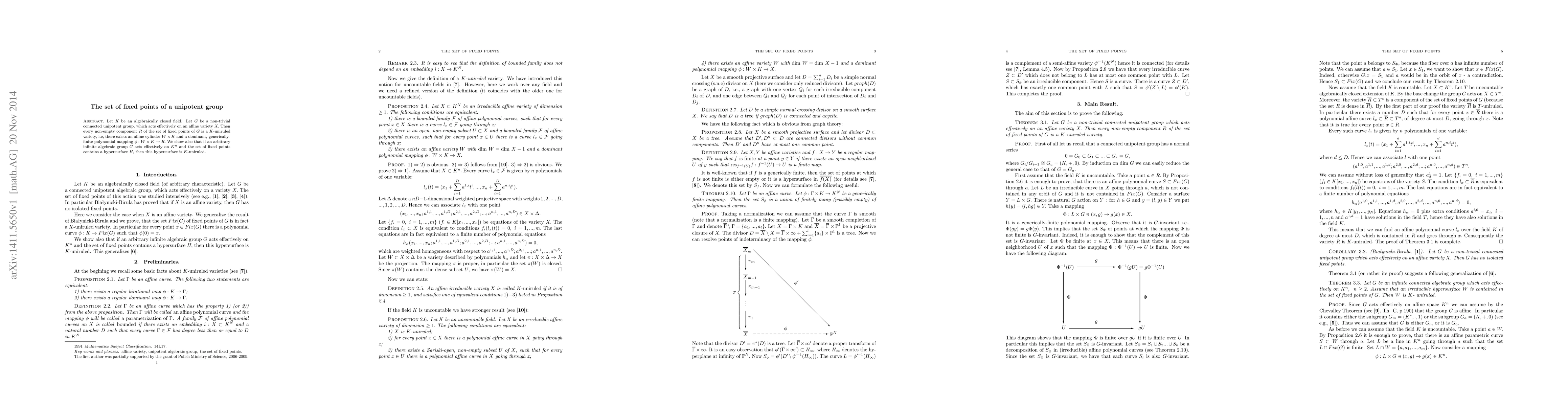 A connected unipotent group acting on an affine variety results in fixed points that are always K-uniruled, meaning they can be mapped to a cylinder with a generically-finite polynomial.