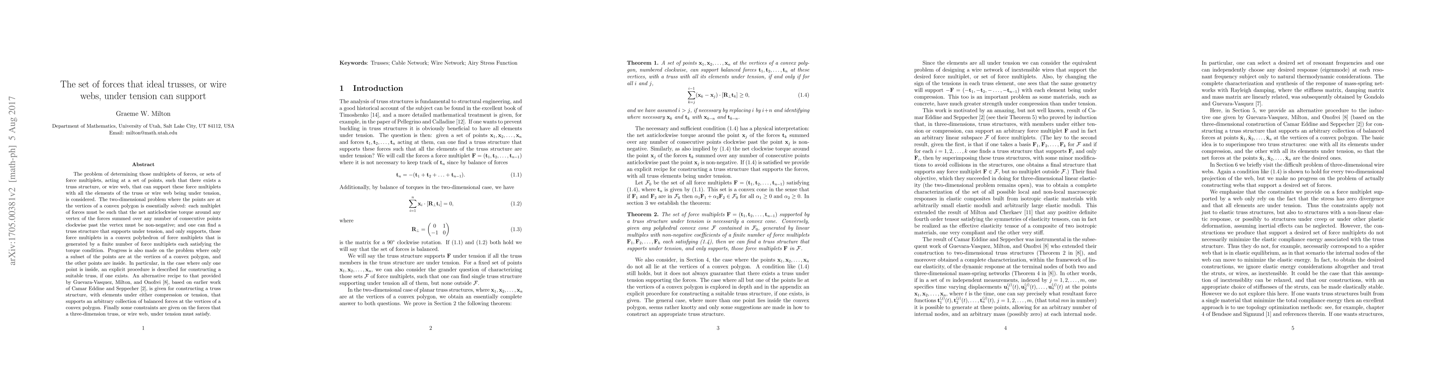 The problem of determining those multiplets of forces, or sets of force multiplets, acting at a set of points, such that there exists a truss structure, or wire web, that can support these force multiplets with all the elements of the truss or wire web being under tension, is considered. The two-dimensional problem where the points are at the vertices of a convex polygon is essentially solved: each multiplet of forces must be such that the net anticlockwise torque around any vertex of the forces summed over any number of consecutive points clockwise past the vertex must be non-negative; and one can find a truss structure that supports under tension, and only supports, those force multiplets in a convex polyhedron of force multiplets that is generated by a finite number of force multiplets each satisfying the torque condition. Progress is also made on the problem where only a subset of the points are at the vertices of a convex polygon, and the other points are inside. In particular, in the case where only one point is inside, an explicit procedure is described for constructing a suitable truss, if one exists. An alternative recipe to that provided by Guevara-Vasquez, Milton, and Onofrei (2011), based on earlier work of Camar Eddine and Seppecher (2003), is given for constructing a truss structure, with elements under either compression or tension, that supports an arbitrary collection of balanced forces at the vertices of a convex polygon. Finally some constraints are given on the forces that a three-dimension truss, or wire web, under tension must satisfy.