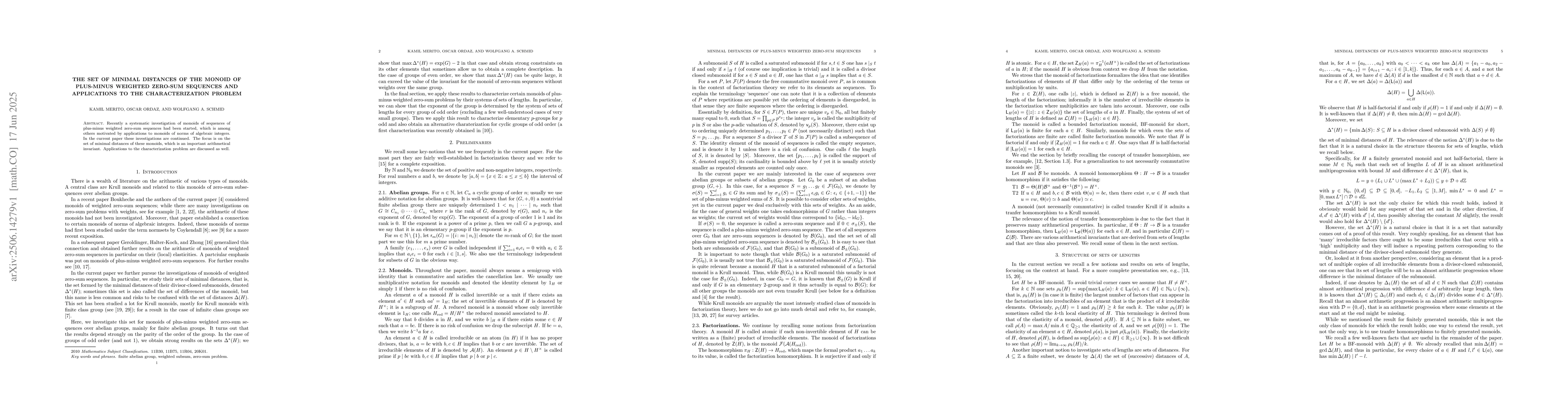 Recently a systematic investigation of monoids of sequences of plus-minus weighted zero-sum sequences had been started, which is among others motivated by applications to monoids of norms of algebraic integers. In the current paper these investigations are continued. The focus is on the set of minimal distances of these monoids, which is an important arithmetical invariant. Applications to the characterization problem are discussed as well.