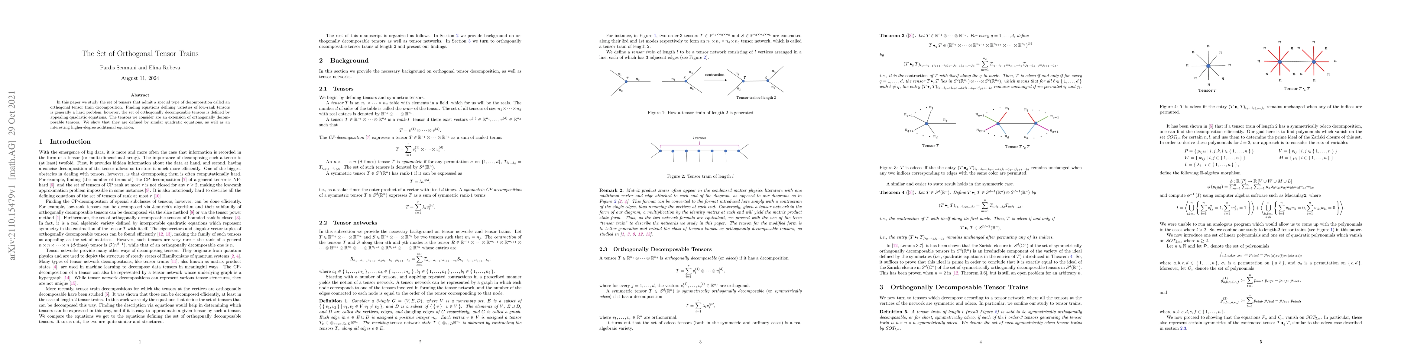 This paper explores tensors with an orthogonal tensor train decomposition, revealing that they are defined by quadratic equations, with a supplementary higher-degree equation distinguishing this extended set from traditional orthogonally decomposable tensors.