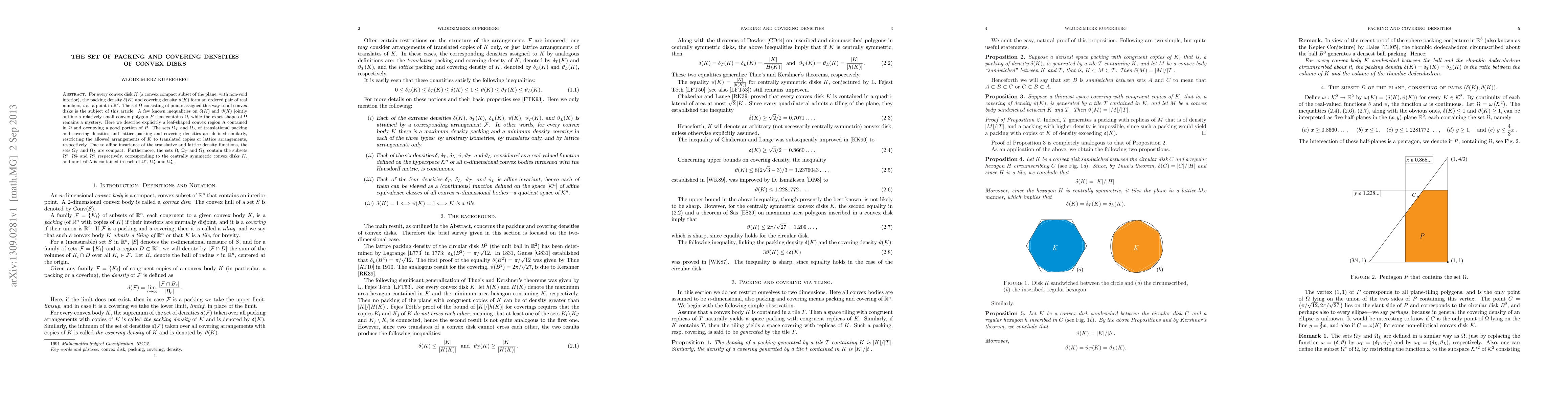 This paper explores the set $\Omega$ of packing and covering densities for all convex disks in the plane, revealing a leaf-shaped convex region $\Lambda$ that occupies a significant portion of a known convex polygon $P$ containing $\Omega$. It also defines $\Omega_T$ and $\Omega_L$ for translational and lattice arrangements, respectively, noting their compactness and inclusion of centrally symmetric convex disks.