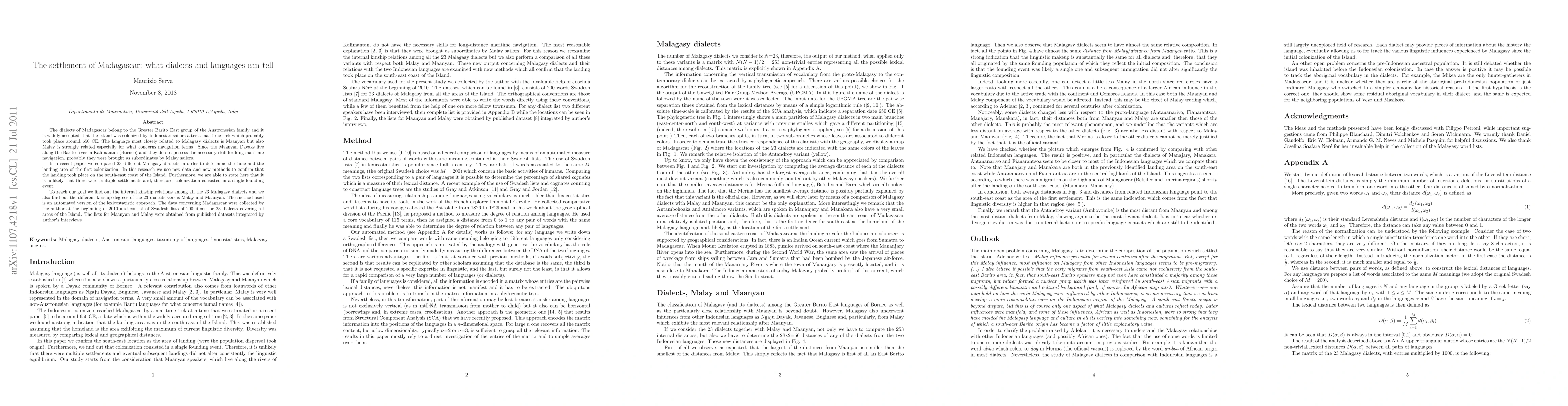 The dialects of Madagascar belong to the Greater Barito East group of the Austronesian family and it is widely accepted that the Island was colonized by Indonesian sailors after a maritime trek which probably took place around 650 CE. The language most closely related to Malagasy dialects is Maanyan but also Malay is strongly related especially for what concerns navigation terms. Since the Maanyan Dayaks live along the Barito river in Kalimantan (Borneo) and they do not possess the necessary skill for long maritime navigation, probably they were brought as subordinates by Malay sailors. In a recent paper we compared 23 different Malagasy dialects in order to determine the time and the landing area of the first colonization. In this research we use new data and new methods to confirm that the landing took place on the south-east coast of the Island. Furthermore, we are able to state here that it is unlikely that there were multiple settlements and, therefore, colonization consisted in a single founding event. To reach our goal we find out the internal kinship relations among all the 23 Malagasy dialects and we also find out the different kinship degrees of the 23 dialects versus Malay and Maanyan. The method used is an automated version of the lexicostatistic approach. The data concerning Madagascar were collected by the author at the beginning of 2010 and consist of Swadesh lists of 200 items for 23 dialects covering all areas of the Island. The lists for Maanyan and Malay were obtained from published datasets integrated by author's interviews.