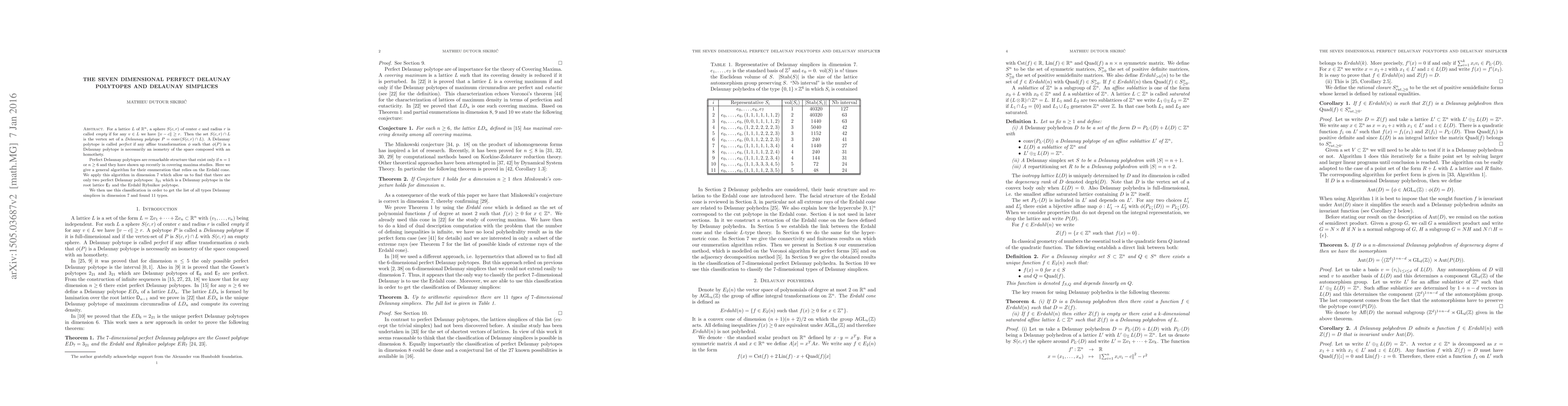The paper presents an algorithm for enumerating perfect Delaunay polytopes using the Erdahl cone, finding two such polytopes in dimension 7: $3_{21}$ in the $\mathsf{E}_7$ root lattice and the Erdahl-Rybnikov polytope. It also classifies all types of Delaunay simplices in dimension 7, revealing 11 distinct types.