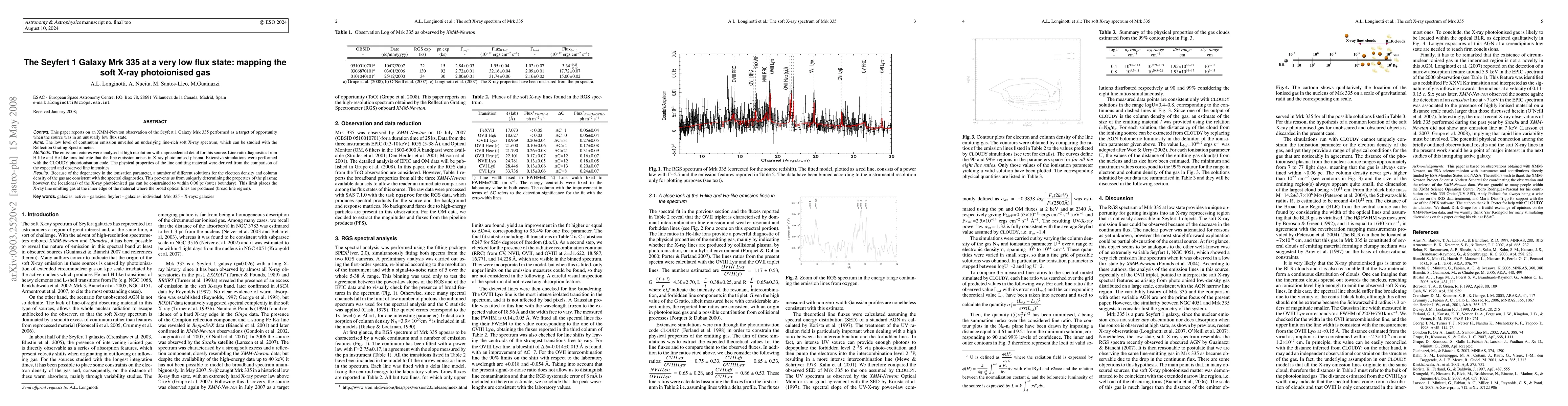 This paper reports on an XMM-Newton observation of the Seyfert 1 Galaxy Mrk 335 performed as a Target of Opportunity when the source was in an unusually low flux state. The low level of continuum emission unveiled an underlying line-rich soft X-ray spectrum, which can be studied with the Reflection Grating Spectrometer. The emission features have been analysed at high resolution with unprecedented detail for this source. Line ratios diagnostic from H-like and He-like ions indicates that the line emission arises in X-ray photoionised plasma. Extensive simulations have been performed with the CLOUDY photoionisation code. From the comparison of the expected and observed line intensities the physical properties of the line emitting material were derived. Because of the degeneracy in the ionisation parameter, a number of different solutions in terms of electron density and column density of the gas are consistent with the spectral diagnostics. This prevents us from determining uniquely the properties of the plasma; however, the location(s) of the X-ray photoionised gas can be constrained to be within 0.06 pc (outer boundary). This limit places the X-ray line emitting gas at the inner edge of the material where the broad optical lines are produced (Broad Line Region).