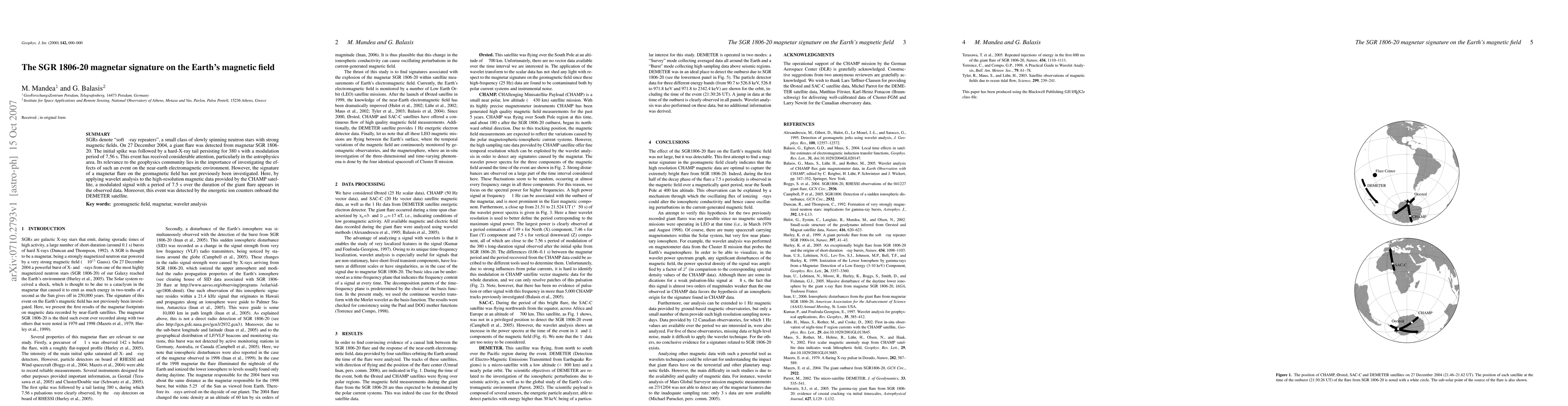 SGRs denote ``soft $\gamma$-ray repeaters'', a small class of slowly spinning neutron stars with strong magnetic fields. On 27 December 2004, a giant flare was detected from magnetar SGR 1806-20. The initial spike was followed by a hard-X-ray tail persisting for 380 s with a modulation period of 7.56 s. This event has received considerable attention, particularly in the astrophysics area. Its relevance to the geophysics community lies in the importance of investigating the effects of such an event on the near-earth electromagnetic environment. However, the signature of a magnetar flare on the geomagnetic field has not previously been investigated. Here, by applying wavelet analysis to the high-resolution magnetic data provided by the CHAMP satellite, a modulated signal with a period of 7.5 s over the duration of the giant flare appears in the observed data. Moreover, this event was detected by the energetic ion counters onboard the DEMETER satellite.