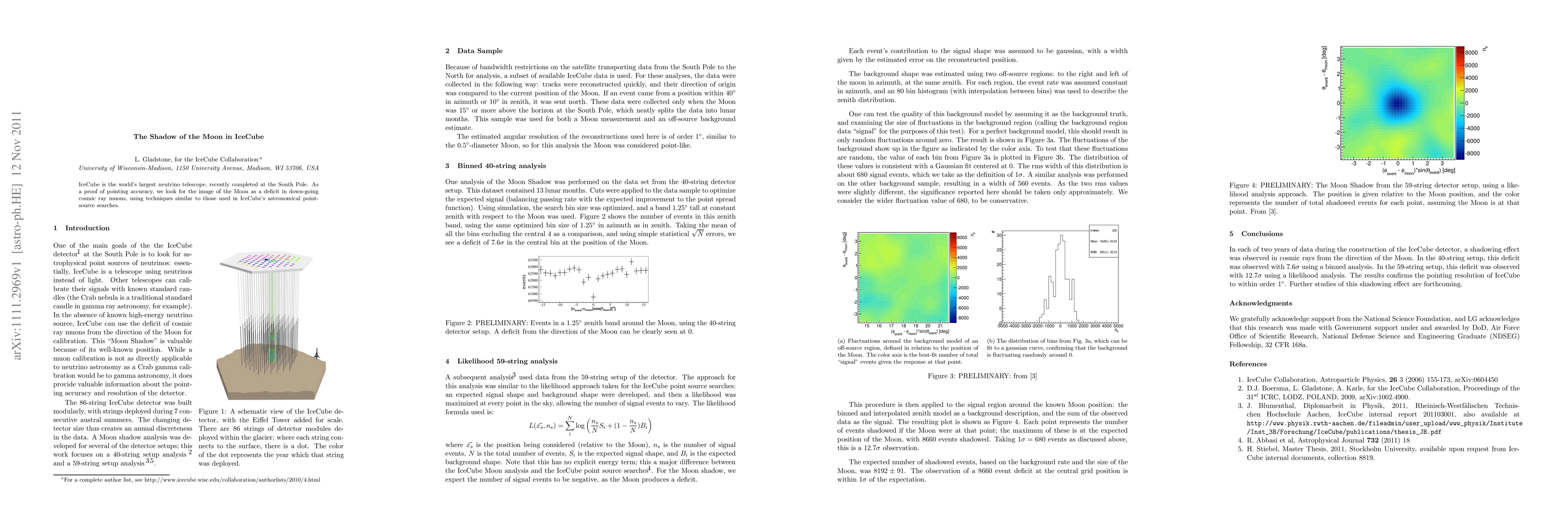 Summary: IceCube, a neutrino telescope at the South Pole, verifies its pointing accuracy by detecting a lunar shadow as a deficit in down-going cosmic ray muons, employing methods akin to its astronomical point-source searches. This observation confirms the telescope's precision and operational capabilities.