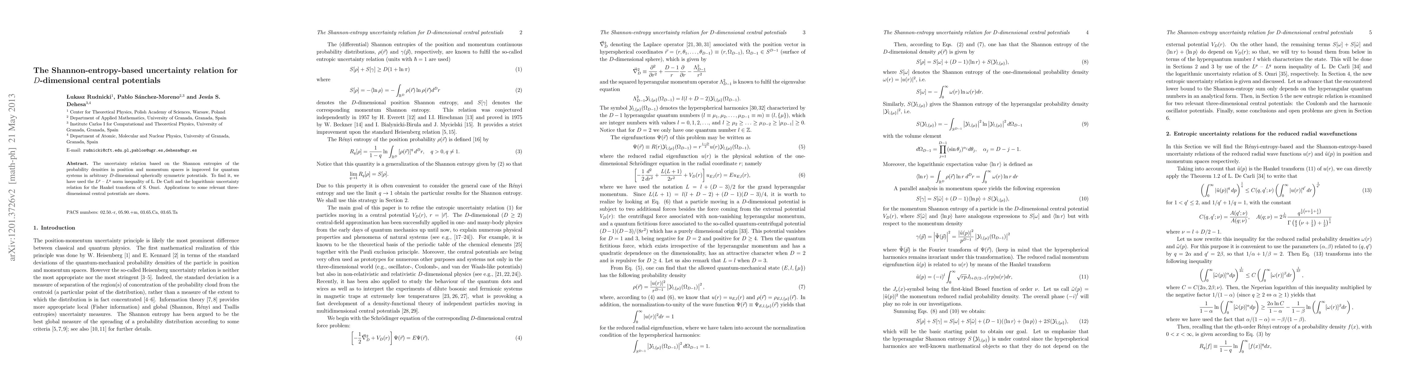 The uncertainty relation based on the Shannon entropies of the probability densities in position and momentum spaces is improved for quantum systems in arbitrary $D$-dimensional spherically symmetric potentials. To find it, we have used the $L^p$ -- $L^q$ norm inequality of L. De Carli and the logarithmic uncertainty relation for the Hankel transform of S. Omri. Applications to some relevant three-dimensional central potentials are shown.
