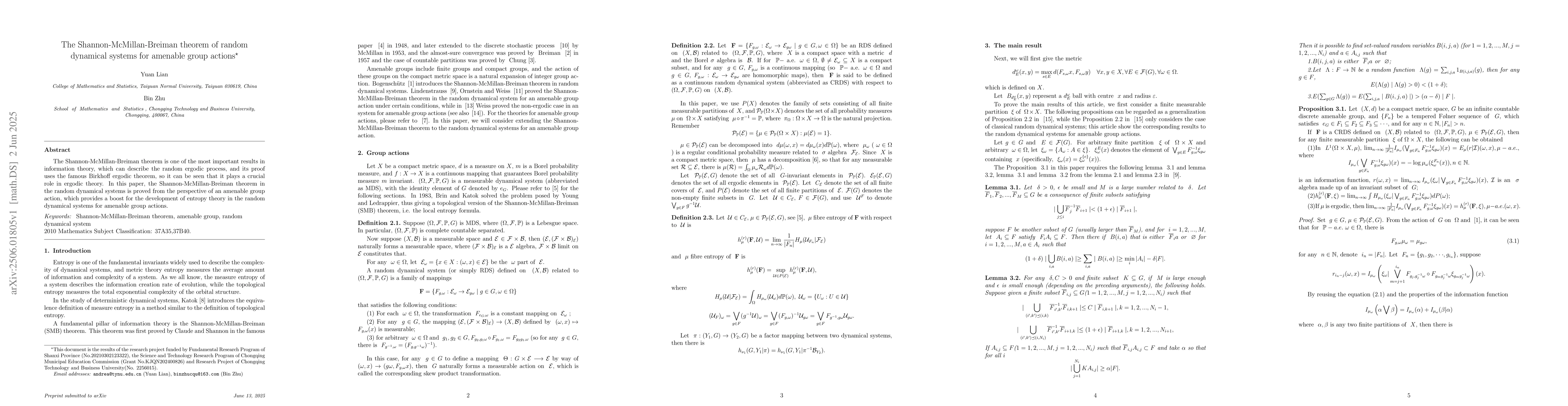 The proof of the Shannon-McMillan-Breiman theorem for random dynamical systems using amenable group actions, extending existing ergodic theory.