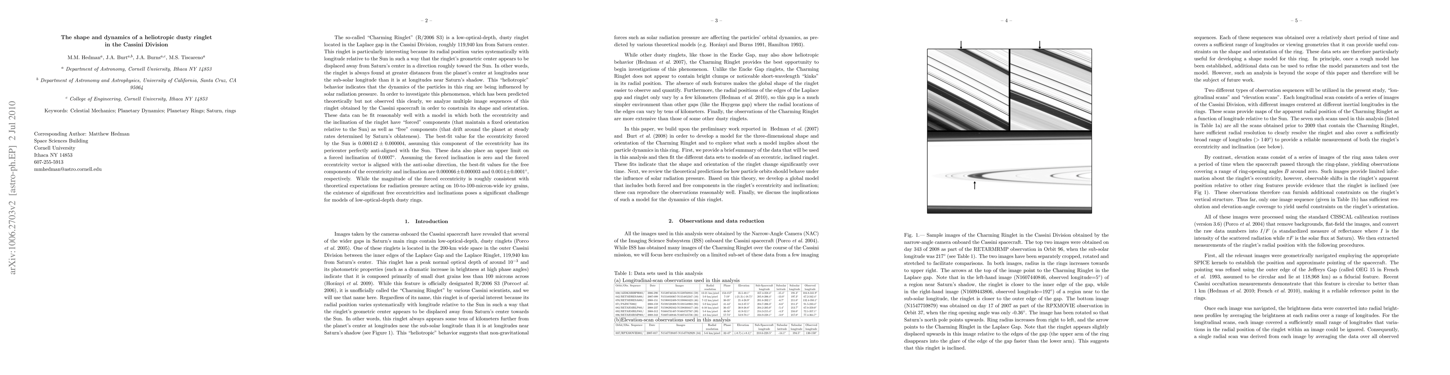 This paper investigates the heliotropic behavior of Saturn's "Charming Ringlet" (R/2006 S3), which shows a systematic variation in radial position relative to the Sun, suggesting solar radiation pressure influences its dynamics. Analysis of Cassini images reveals a model where both forced and free eccentricity and inclination components exist, challenging existing models of low-optical-depth dusty rings.