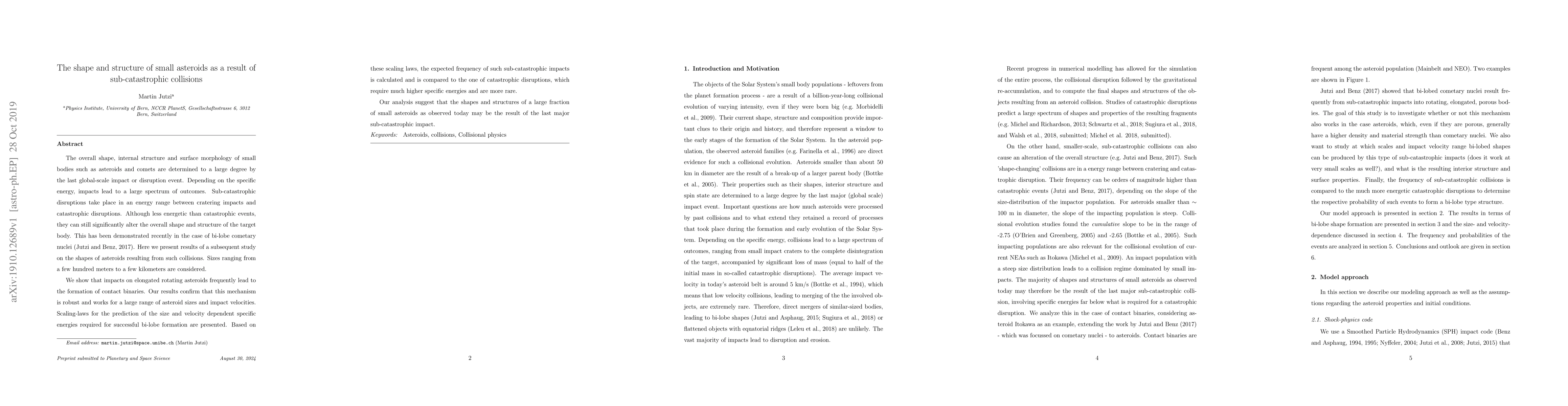The study reveals that sub-catastrophic collisions significantly shape small asteroids, often forming contact binaries. Scaling laws predict the size and velocity-dependent energies for bi-lobe formation, suggesting that many small asteroids' current shapes result from their last major sub-catastrophic impact.