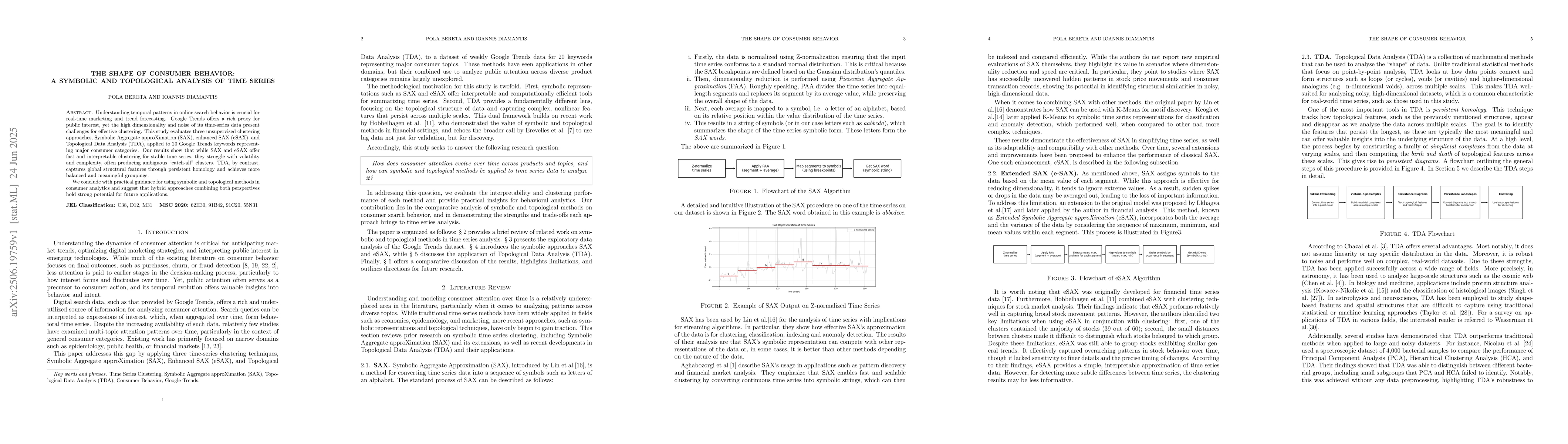 Understanding temporal patterns in online search behavior is crucial for real-time marketing and trend forecasting. Google Trends offers a rich proxy for public interest, yet the high dimensionality and noise of its time-series data present challenges for effective clustering. This study evaluates three unsupervised clustering approaches, Symbolic Aggregate approXimation (SAX), enhanced SAX (eSAX), and Topological Data Analysis (TDA), applied to 20 Google Trends keywords representing major consumer categories. Our results show that while SAX and eSAX offer fast and interpretable clustering for stable time series, they struggle with volatility and complexity, often producing ambiguous ``catch-all'' clusters. TDA, by contrast, captures global structural features through persistent homology and achieves more balanced and meaningful groupings. We conclude with practical guidance for using symbolic and topological methods in consumer analytics and suggest that hybrid approaches combining both perspectives hold strong potential for future applications.
