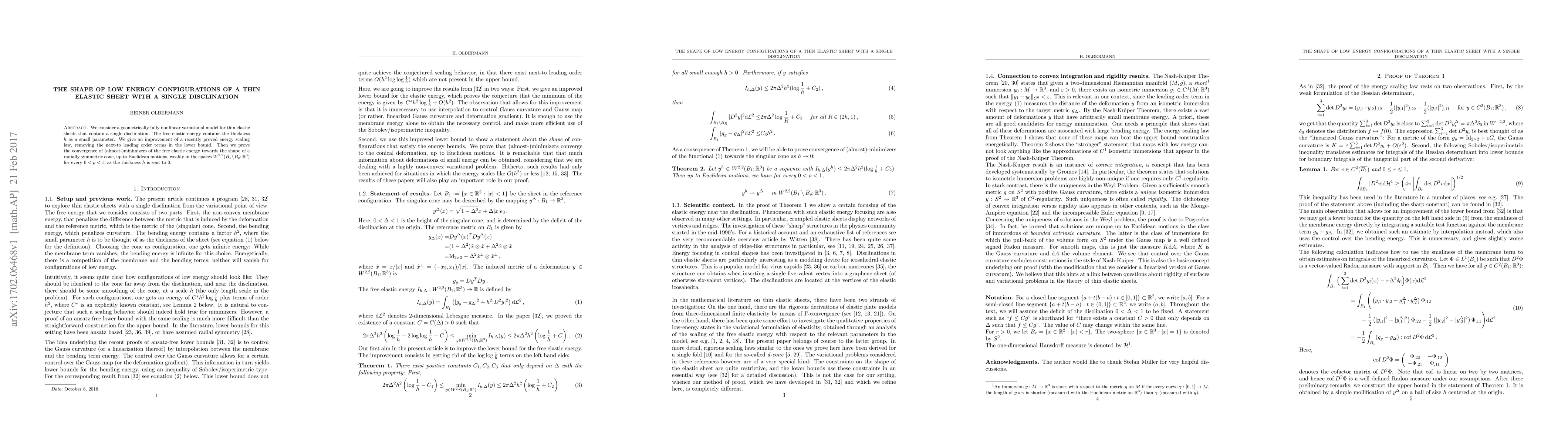 This paper studies the low energy configurations of thin elastic sheets with a single disclination, improving an energy scaling law and proving the convergence of minimizers to a radially symmetric cone shape as the sheet thickness approaches zero. The results are shown to hold weakly in specific function spaces.