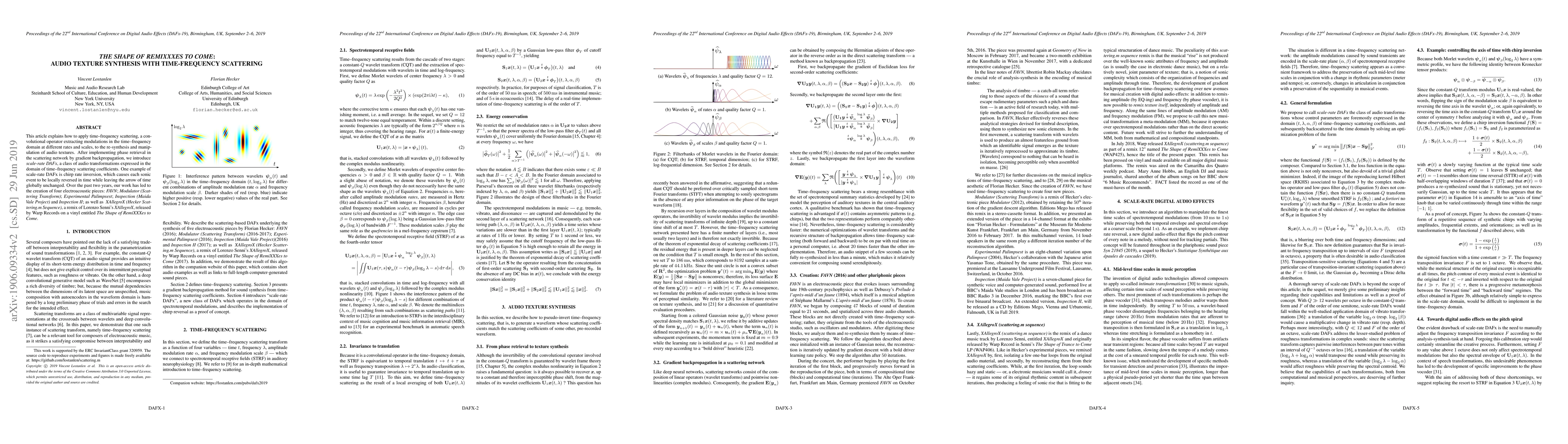 This article explains how to apply time--frequency scattering, a convolutional operator extracting modulations in the time--frequency domain at different rates and scales, to the re-synthesis and manipulation of audio textures. After implementing phase retrieval in the scattering network by gradient backpropagation, we introduce scale--rate DAFx, a class of audio transformations expressed in the domain of time--frequency scattering coefficients. One example of scale--rate DAFx is chirp rate inversion, which causes each sonic event to be locally reversed in time while leaving the arrow of time globally unchanged. Over the past two years, our work has led to the creation of four electroacoustic pieces: ``FAVN''; ``Modulator (Scattering Transform)''; ``Experimental Palimpsest''; ``Inspection''; and a remix of Lorenzo Senni's ``XAllegroX'', released by Warp Records on a vinyl entitled ``The Shape of RemiXXXes to Come''. The source code to reproduce experiments and figures is made freely available at: https://github.com/lostanlen/scattering.m. A companion website containing demos is at: https://lostanlen.com/pubs/dafx2019