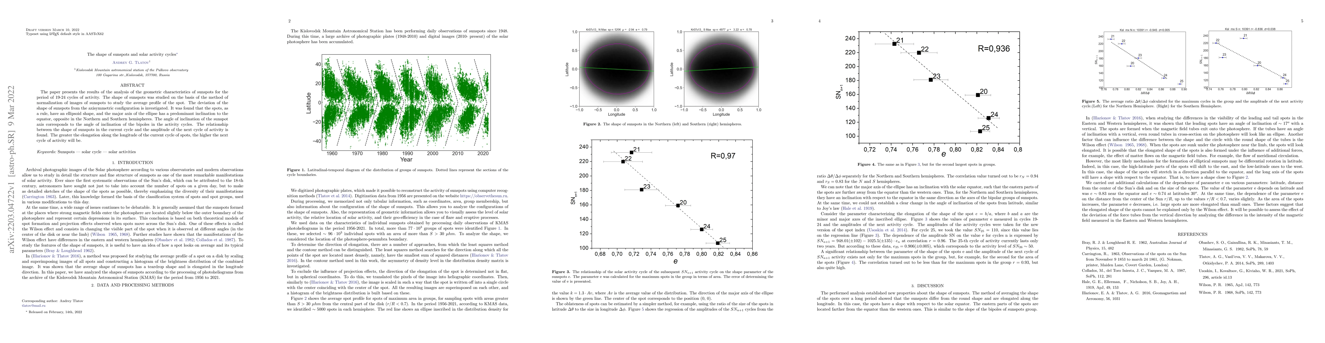 This paper analyzes sunspot shapes over 19-24 solar activity cycles, finding that most sunspots are ellipsoidal with major axes inclined towards the equator, oppositely in each hemisphere. It also reveals a correlation between the elongation of current cycle spots and the amplitude of the next activity cycle.