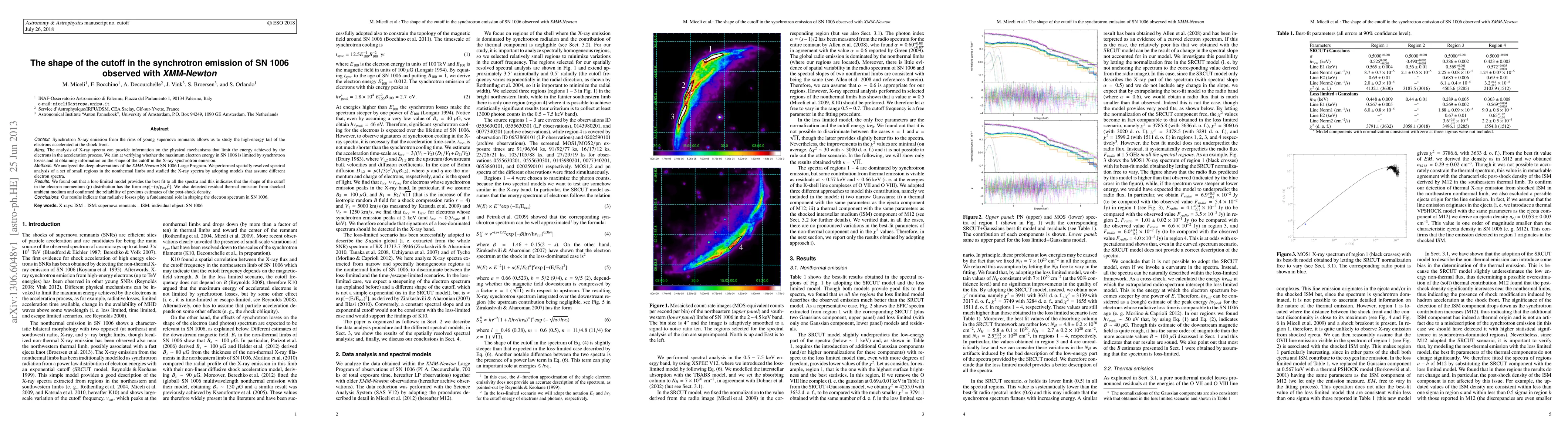 Synchrotron X-ray emission from the rims of young supernova remnants allows us to study the high-energy tail of the electrons accelerated at the shock front. The analysis of X-ray spectra can provide information on the physical mechanisms that limit the energy achieved by the electrons in the acceleration process. We aim at verifying whether the maximum electron energy in SN 1006 is limited by synchrotron losses and at obtaining information on the shape of the cutoff in the X-ray synchrotron emission. We analyzed the deep observations of the XMM-Newton SN 1006 Large Program. We performed spatially resolved spectral analysis of a set of small regions in the nonthermal limbs and studied the X-ray spectra by adopting models that assume different electron spectra. We found out that a loss-limited model provides the best fit to all the spectra and this indicates that the shape of the cutoff in the electron momentum (p) distribution has the form exp[-(p/p_cut)^2]. We also detected residual thermal emission from shocked ambient medium and confirmed the reliability of previous estimates of the post-shock density. Our results indicate that radiative losses play a fundamental role in shaping the electron spectrum in SN 1006.