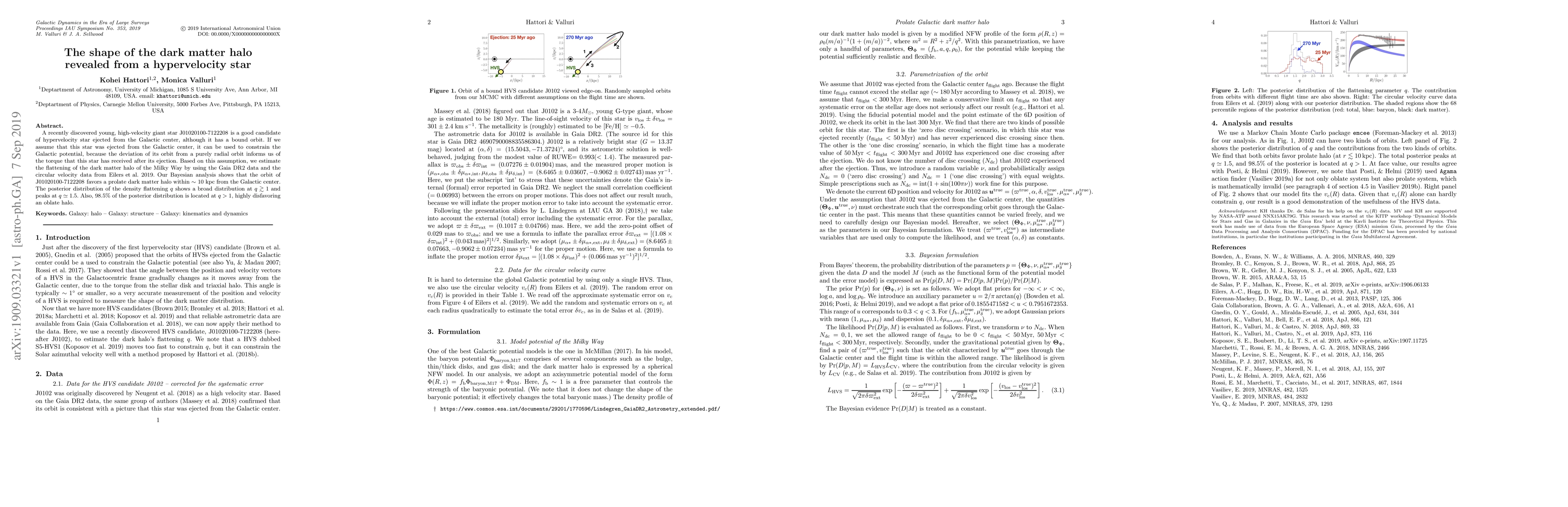 This paper uses the hypervelocity star J01020100-7122208 to constrain the Galactic potential and estimate the shape of the Milky Way's dark matter halo. The Bayesian analysis indicates a prolate dark matter halo within 10 kpc from the Galactic center, with a density flattening $q \simeq 1.5$ and disfavoring an oblate shape.