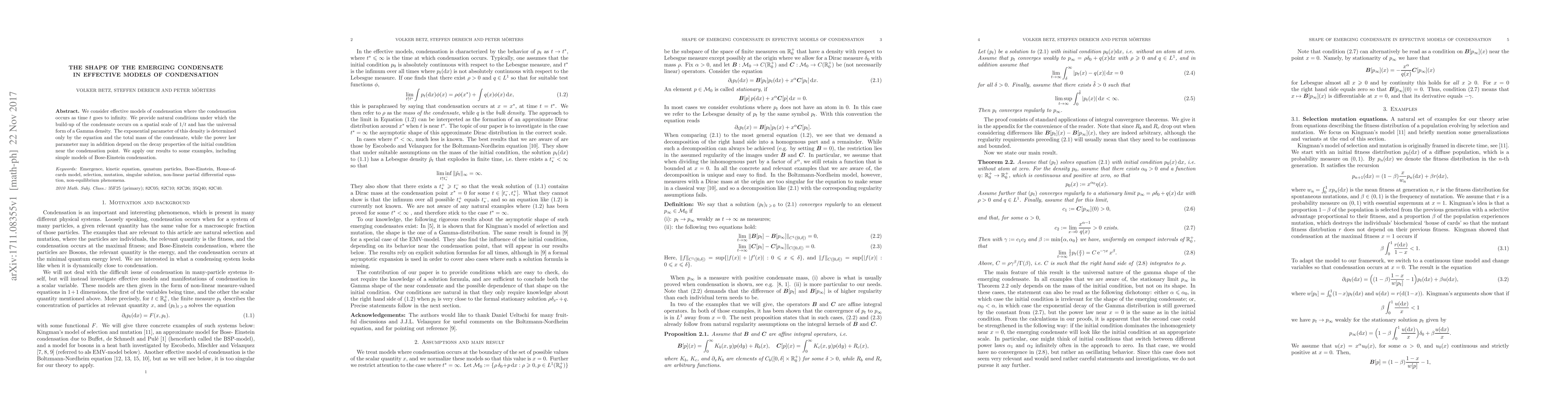 This research identifies conditions under which a condensate forms in effective models, scaling with 1/t and resembling a Gamma density. The density's exponential parameter is tied to the equation and total condensate mass, while its power law parameter can depend on initial condition decay properties near the condensation point. Examples include simple Bose-Einstein condensation models.
