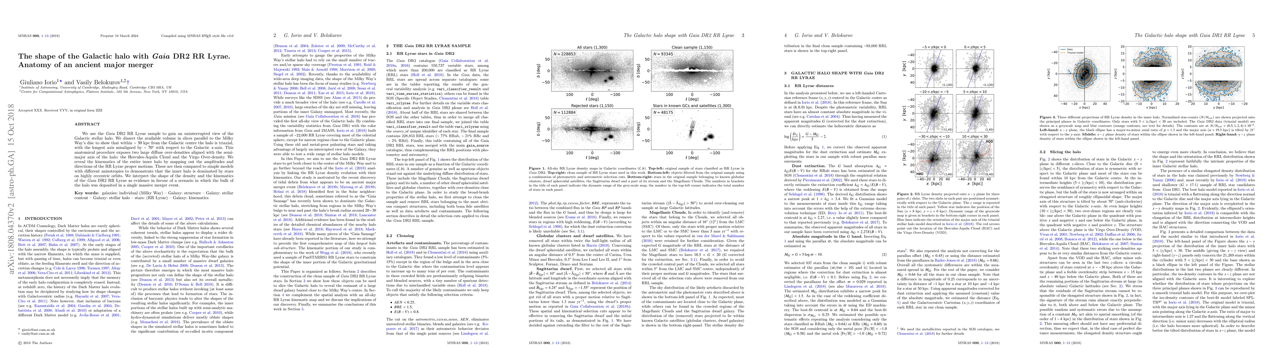 We use the $Gaia$ DR2 RR Lyrae sample to gain an uninterrupted view of the Galactic stellar halo. We dissect the available volume in slices parallel to the Milky Way's disc to show that within $\sim30$ kpc from the Galactic centre the halo is triaxial, with the longest axis misaligned by $\sim70^{\circ}$ with respect to the Galactic $x$-axis. This anatomical procedure exposes two large diffuse over-densities aligned with the semi-major axis of the halo: the Hercules-Aquila Cloud and the Virgo Over-density. We reveal the kinematics of the entire inner halo by mapping out the amplitudes and directions of the RR Lyrae proper motions. These are then compared to simple models with different anisotropies to demonstrate that the inner halo is dominated by stars on highly eccentric orbits. We interpret the shape of the density and the kinematics of the $Gaia$ DR2 RR Lyrae as evidence in favour of a scenario in which the bulk of the halo was deposited in a single massive merger event.