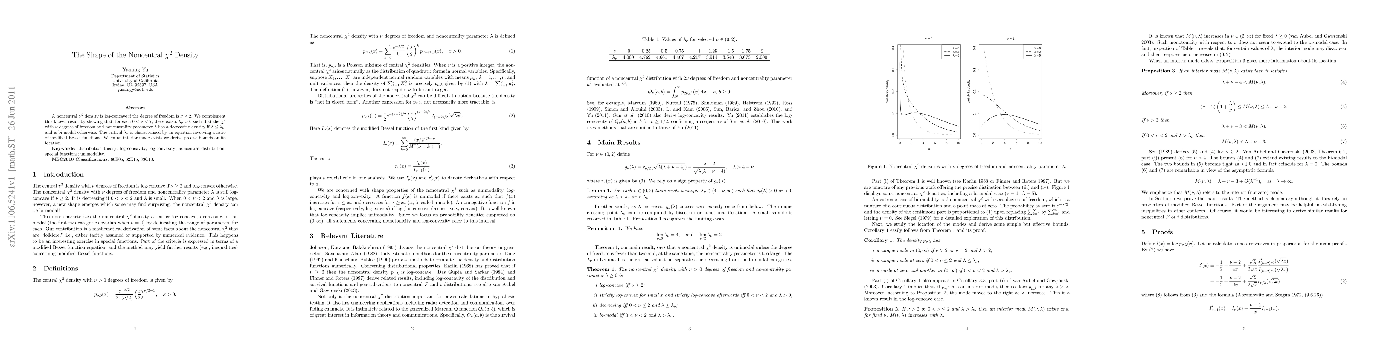 This paper demonstrates that the noncentral chi-square density is log-concave for degrees of freedom greater than or equal to 2. It further shows that for degrees of freedom between 0 and 2, there exists a critical noncentrality parameter that determines whether the density is decreasing or bi-modal, with precise bounds on the location of any interior mode.