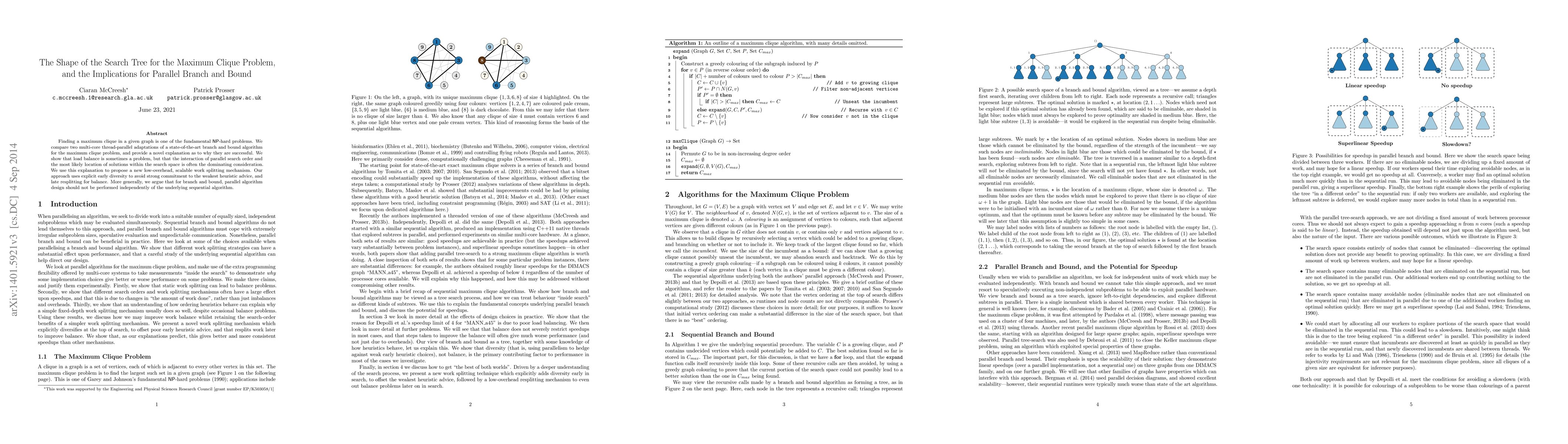 This paper investigates parallel adaptations of a branch and bound algorithm for solving the maximum clique problem, revealing that the success of these adaptations hinges on the interaction between parallel search order and the search space's solution distribution. The authors propose a new scalable work splitting mechanism that leverages early diversity and late resplitting to maintain balance and efficiency.