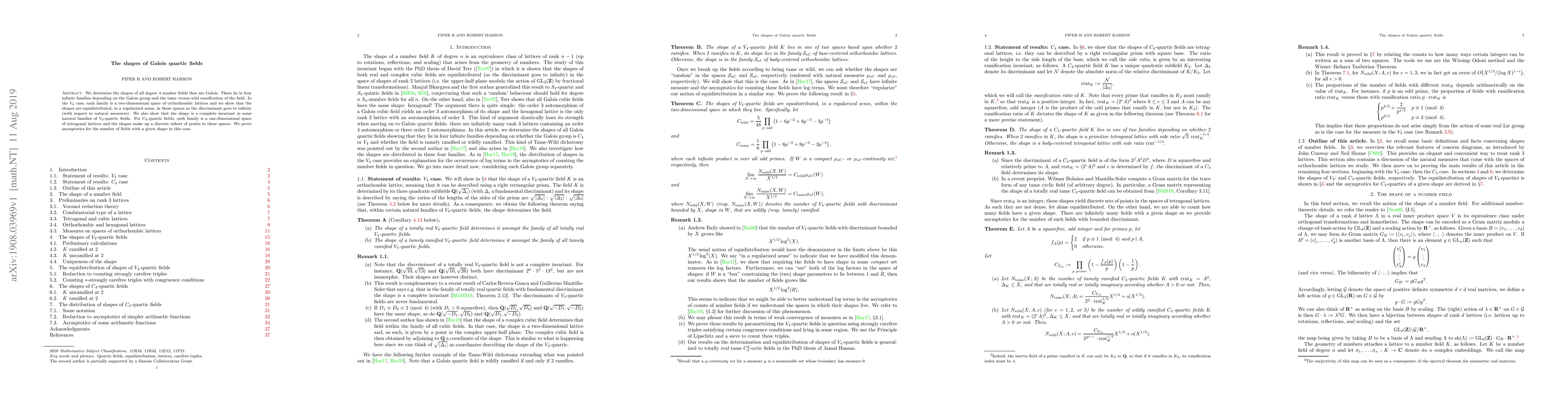 This paper classifies all degree 4 Galois number fields into four infinite families based on their Galois group and ramification type. For $V_4$-quartic fields, the shapes are equidistributed in two-dimensional orthorhombic lattice spaces, while for $C_4$-quartic fields, the shapes form a discrete set in one-dimensional tetragonal lattice spaces, with a proven asymptotic count for the latter.