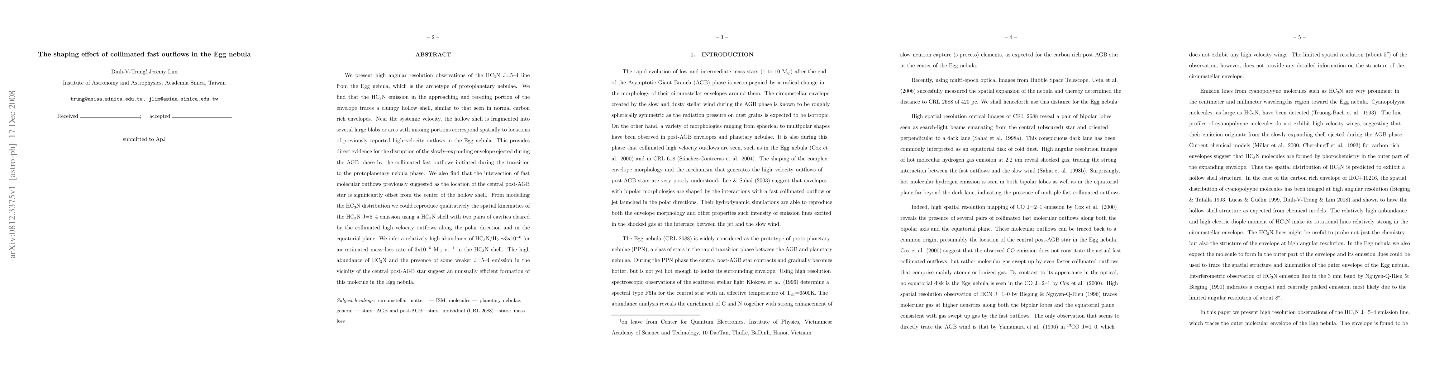 High-resolution observations of the Egg nebula reveal a clumpy hollow shell in HC3N emission, fragmented by fast, collimated outflows from the protoplanetary phase. The findings suggest disruption of the AGB envelope, high HC3N abundance, and an unusually efficient formation of this molecule in the Egg nebula.