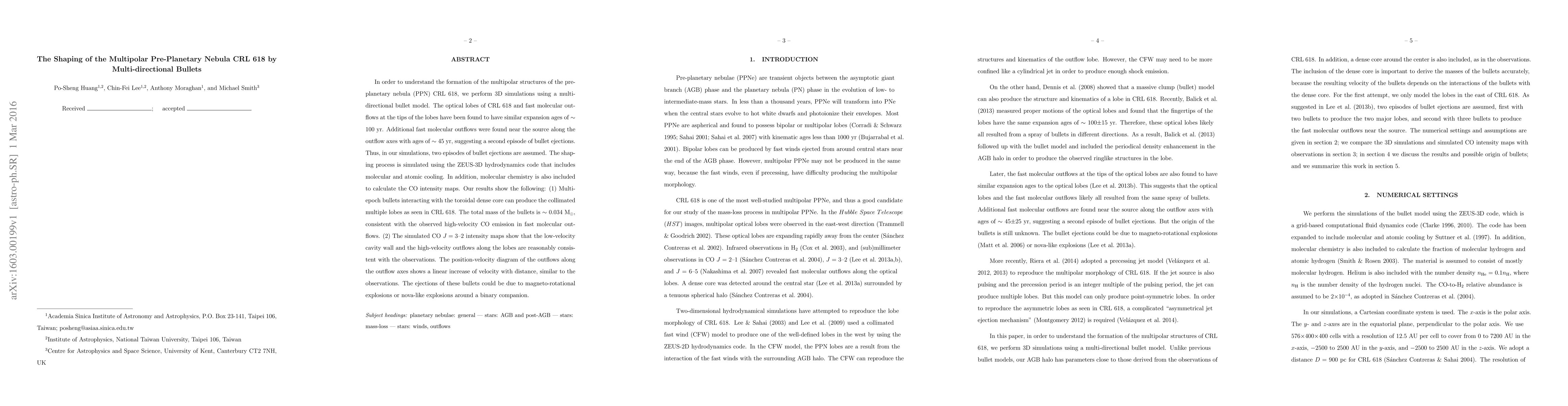 This paper uses 3D simulations to explore the formation of CRL 618's multipolar structure, attributing it to multi-directional bullet ejections. The simulations, employing the ZEUS-3D code, reveal that two episodes of bullet ejections can produce the observed collimated lobes and molecular outflows, consistent with the nebula's expansion ages and high-velocity CO emissions.
