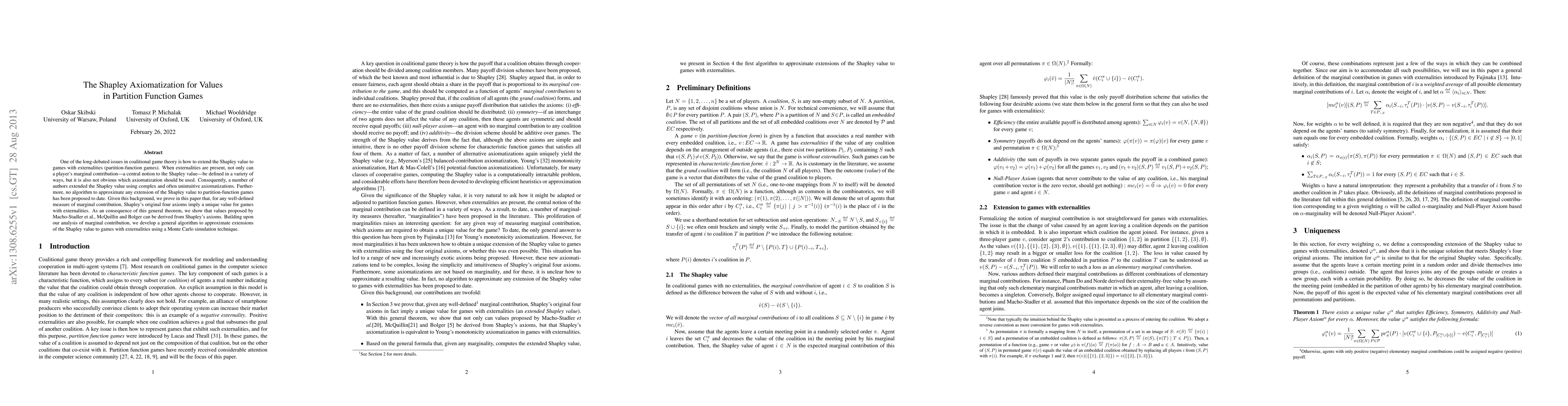 This paper extends the Shapley value to partition-function games with externalities, proving that Shapley's original axioms uniquely determine a value for such games. It also introduces an algorithm based on Monte Carlo simulations to approximate these extended values.