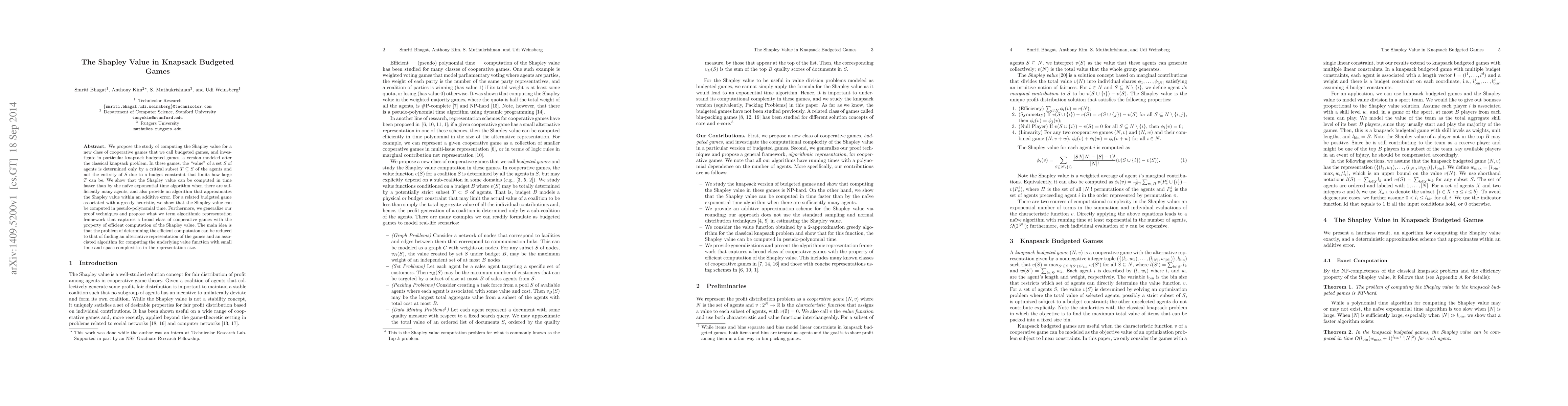 We propose the study of computing the Shapley value for a new class of cooperative games that we call budgeted games, and investigate in particular knapsack budgeted games, a version modeled after the classical knapsack problem. In these games, the "value" of a set $S$ of agents is determined only by a critical subset $T\subseteq S$ of the agents and not the entirety of $S$ due to a budget constraint that limits how large $T$ can be. We show that the Shapley value can be computed in time faster than by the na\"ive exponential time algorithm when there are sufficiently many agents, and also provide an algorithm that approximates the Shapley value within an additive error. For a related budgeted game associated with a greedy heuristic, we show that the Shapley value can be computed in pseudo-polynomial time. Furthermore, we generalize our proof techniques and propose what we term algorithmic representation framework that captures a broad class of cooperative games with the property of efficient computation of the Shapley value. The main idea is that the problem of determining the efficient computation can be reduced to that of finding an alternative representation of the games and an associated algorithm for computing the underlying value function with small time and space complexities in the representation size.