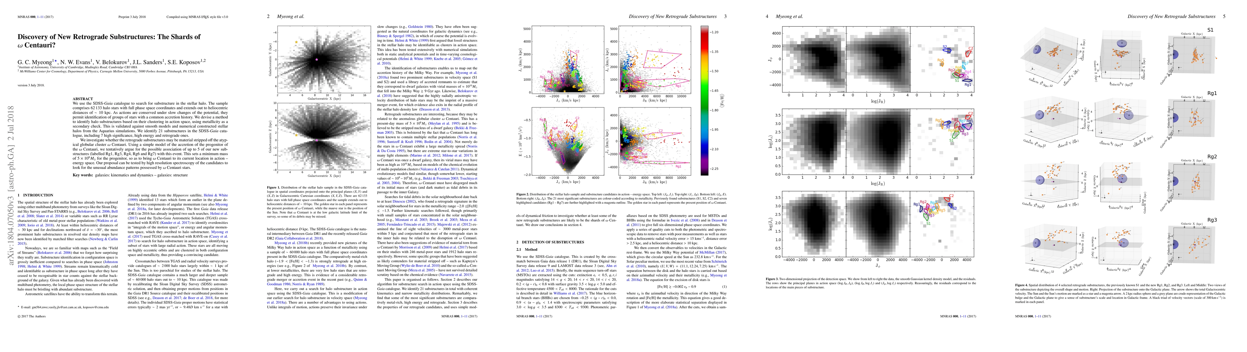 We use the SDSS-Gaia catalogue to search for substructure in the stellar halo. The sample comprises 62\,133 halo stars with full phase space coordinates and extends out to heliocentric distances of $\sim 10$ kpc. As actions are conserved under slow changes of the potential, they permit identification of groups of stars with a common accretion history. We devise a method to identify halo substructures based on their clustering in action space, using metallicity as a secondary check. This is validated against smooth models and numerical constructed stellar halos from the Aquarius simulations. We identify 21 substructures in the SDSS-Gaia catalogue, including 7 high significance, high energy and retrograde ones. We investigate whether the retrograde substructures may be material stripped off the atypical globular cluster $\omega$~Centauri. Using a simple model of the accretion of the progenitor of the $\omega$~Centauri, we tentatively argue for the possible association of up to 5 of our new substructures (labelled Rg1, Rg3, Rg4, Rg6 and Rg7) with this event. This sets a minimum mass of $5 \times 10^8 M_\odot$ for the progenitor, so as to bring $\omega$~Centauri to its current location in action -- energy space. Our proposal can be tested by high resolution spectroscopy of the candidates to look for the unusual abundance patterns possessed by $\omega$~Centauri stars.